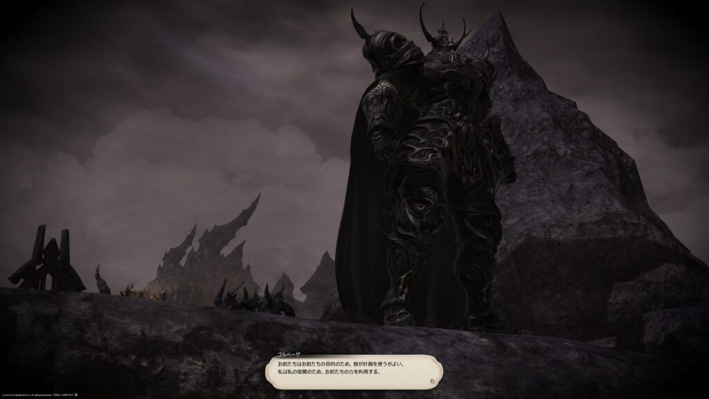 この段階になると、ひたすら気になることはゴルベーザの正体です。次のパッチタイトルは「玉座の咎人」ですよね。間違いなく、それはゴルベーザのことなんだよなあ、と考えながら、前パッチのカットシーンを見てたら、ゴルベーザが何者かを切り捨ててるシーンがあったじゃないですか。ええ、「禁断の記憶」カットシーン2の話です。