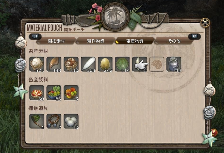 これ、畜産物資の一覧を見ることができる、開拓ポーチの画像なんですけれど。