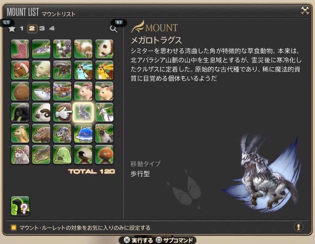 とはいうものの、本当にスローペースです。1日、10個集まったら他のコンテンツを遊ぶ。そんな感じなんだもの。だから目標のマウントを取得したのだって、土曜日です。ようやく虚構が50個集まったから、メガロトラグスを交換してきました。