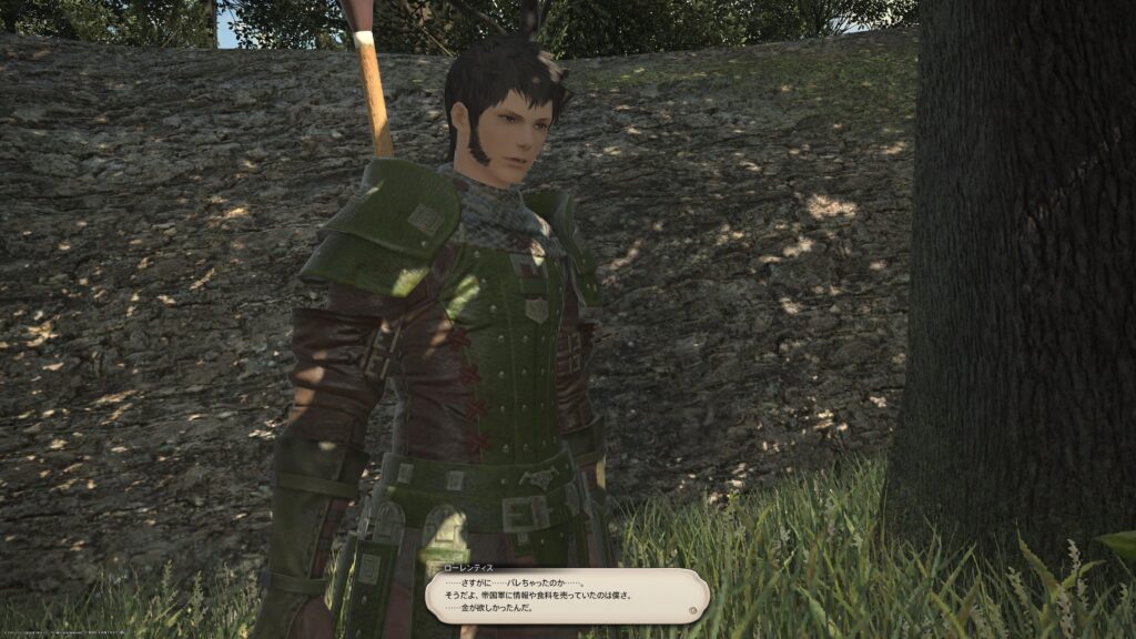 このローレンティスくんは、シルフ族をなぜか追跡している帝国兵に、巡回情報や食糧を売っていた人なんですよね。それに気づいた冒険者に帝国兵をけしかけたりもします。だからちょこーっと腹立たしい存在なんだけど、そのセリフを聞いてたら、なぜか憎めないんですよねえ。