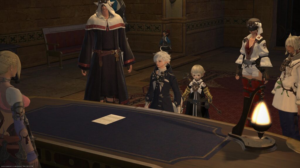 なぜかラムウの件が決着したと知っているアルフィノ少年。どこからその情報を入手したんだろう。わたしが首を捻っている間にも、アルフィノとミンフィリアの会話は続きます。ずいぶん親しそうな様子だから、アルフィノ少年は暁の血盟メンバーなの? と思ってしまうところです。でもアルフィノ少年と冒険者がすれ違っても、ミンフィリアから紹介される様子はない。この時点ではあくまでも、バルデシオン委員会のお使い、という立ち位置なのかしら。