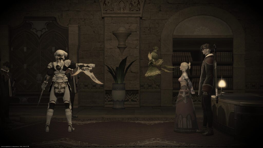 アルフィノの尋ね人のうちひとりは冒険者、そしてもうひとりは、マルケズだったよう。いいえ、アルフィノはマルケズに対し、ガーロンド・アイアンワークス代表、伝説の機工師シドと呼びかけるのです。うめくマルケズ。イリュド氏はその反応を見て、マルケズに荷物を渡して語りかけます。