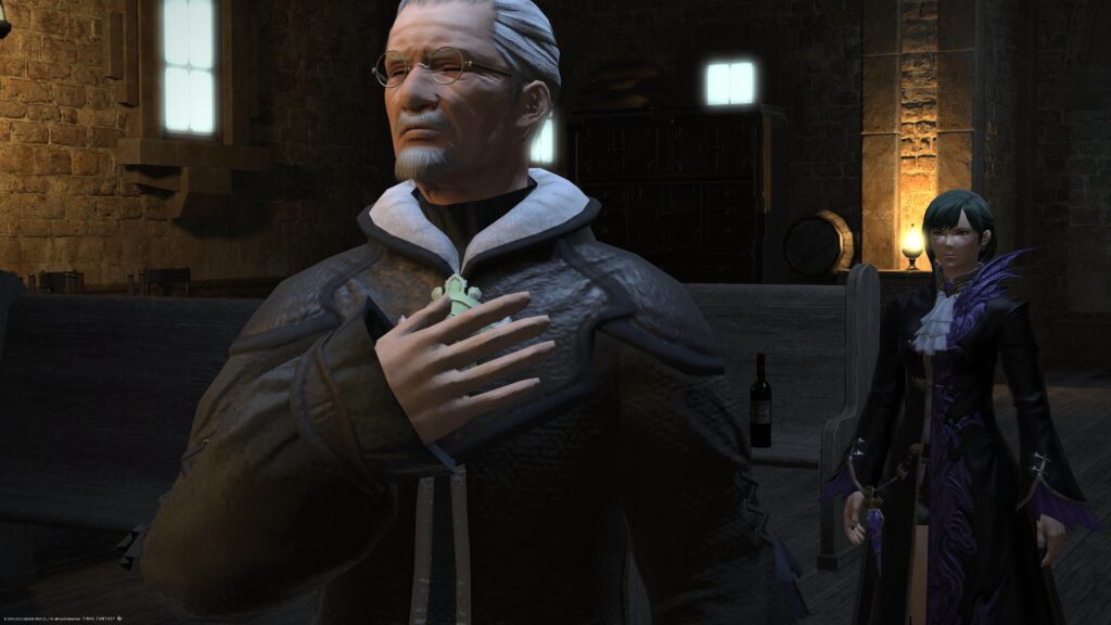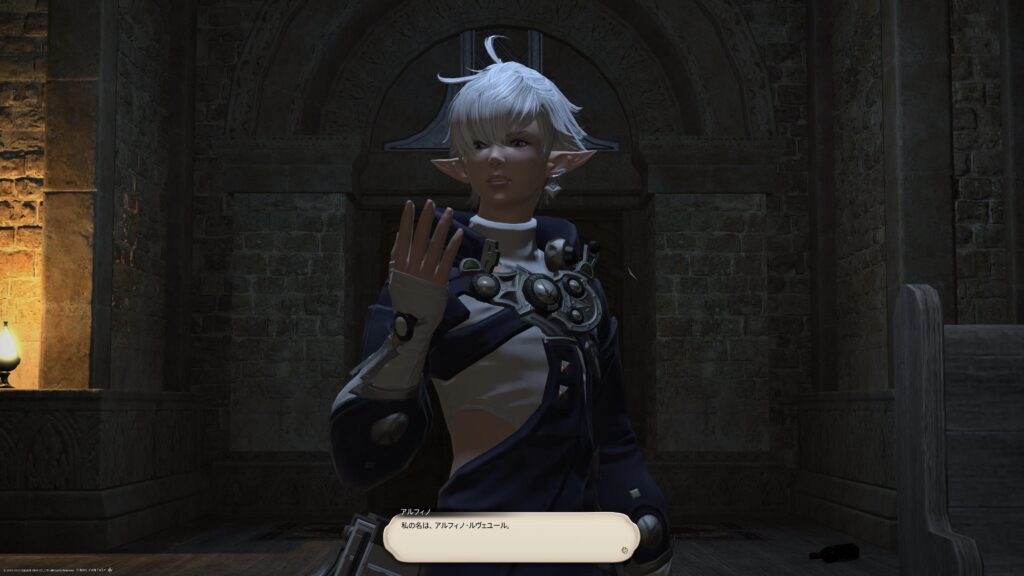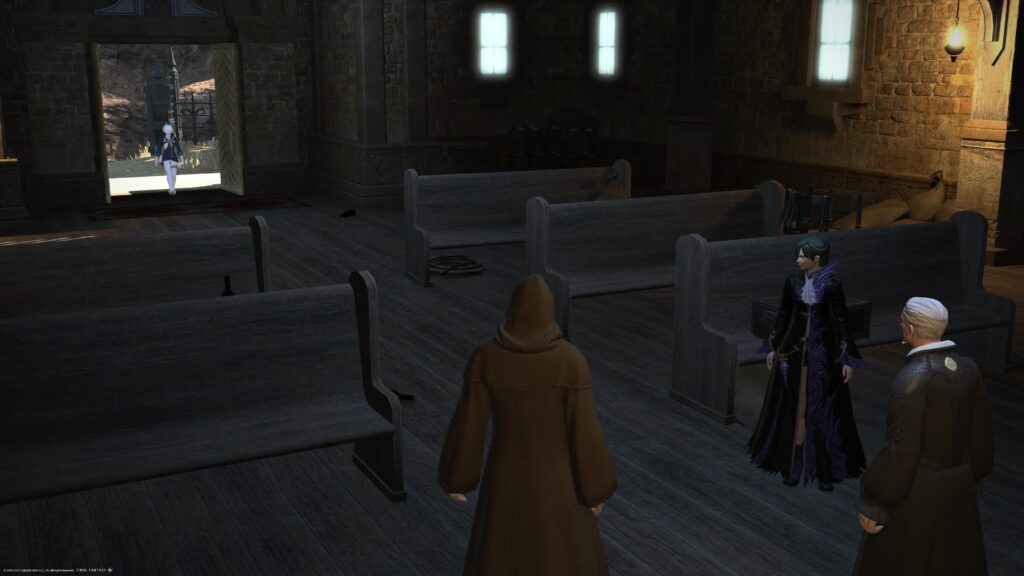 イリュド氏と共に首を傾げていたところ、教会の扉が大きく開かれます。ゆっくり入ってきた人物はアルフィノ。