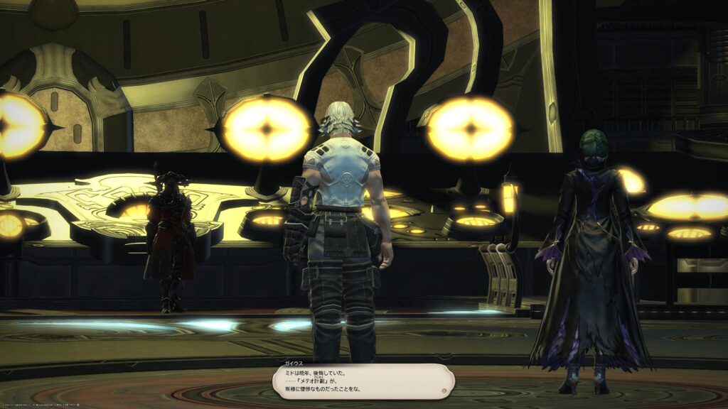 もっともガイウスが待っていた人物は、あくまでもシド。冒険者はついででしょう。ガイウスは、シドのお父さん、ガイウスの親友でもあったミド・ナン・ガーロンド氏の心残りをシドに話したかったよう。総責任者を務めていたメテオ計劃が凄惨なものになったことに対してミドは後悔していた、息子にすまないことをしたと言っていた、と。