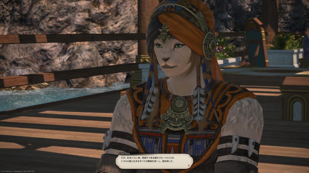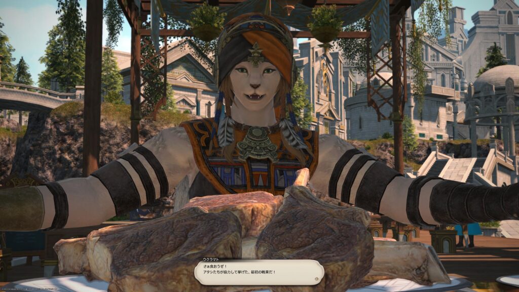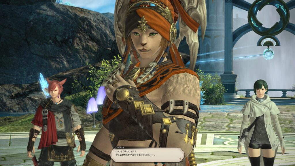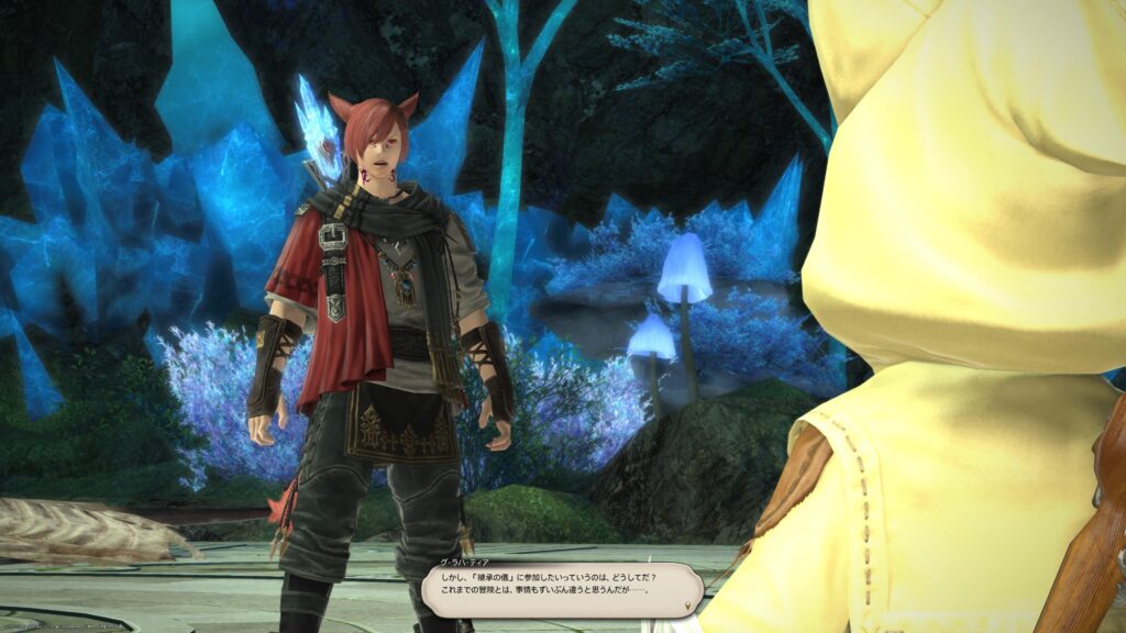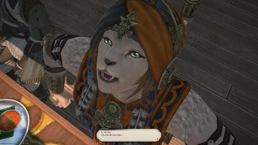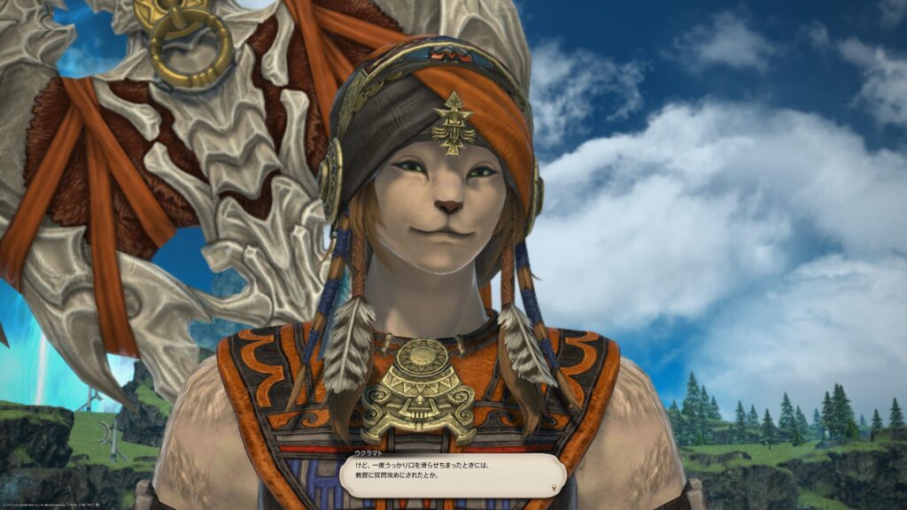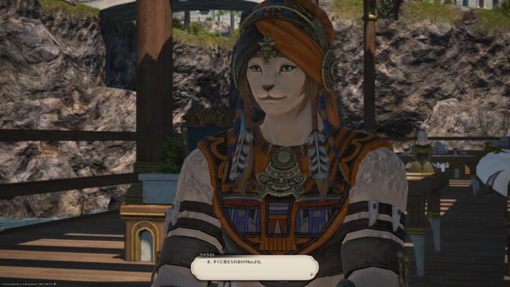 そんなウクラマトとエレンヴィルの会話に、気になる名前が登場しました。コーナ兄さん。グ・ラハが訊ねると、そのコーナ兄さんとやらは、ウクラマトの二番目のお兄さん。そしてオールド・シャーレアンの魔法大学に留学していた人で、おまけにミコッテ族なんだとか。だから身分を伏せて留学ということができたみたいですね。