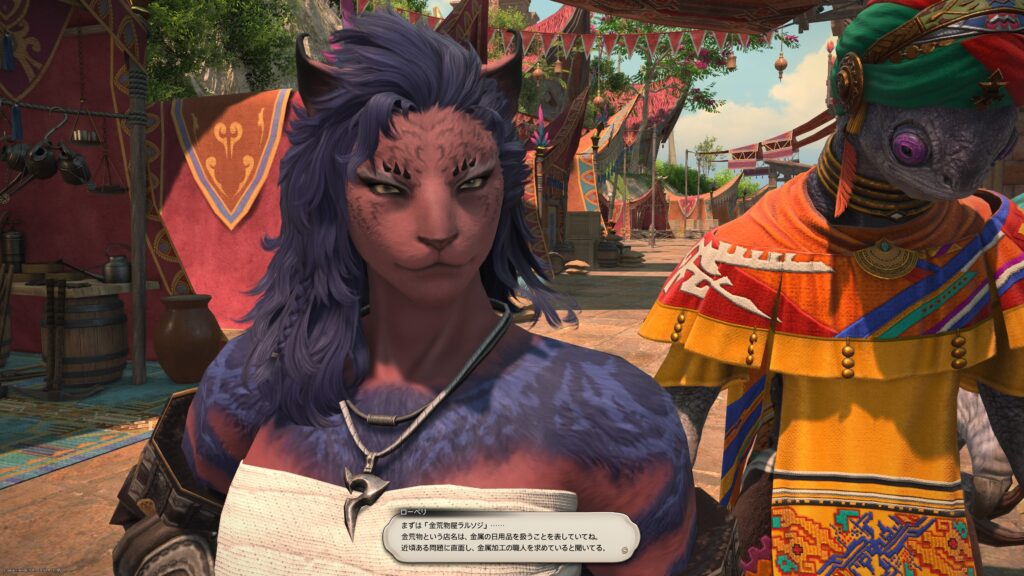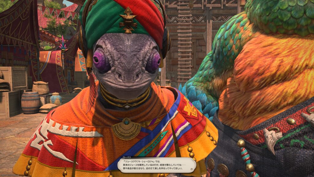 それで冒険者が調達役として来たのだと告げたとき、もう一人、ウヴロと名乗るヴィエラ族がやってきて、「俺をここで雇ってくれ! 働きながら、シャトナ族について学びたいんだ」と言うのです。なんと文無し状態だから、他に頼るところもないみたい。