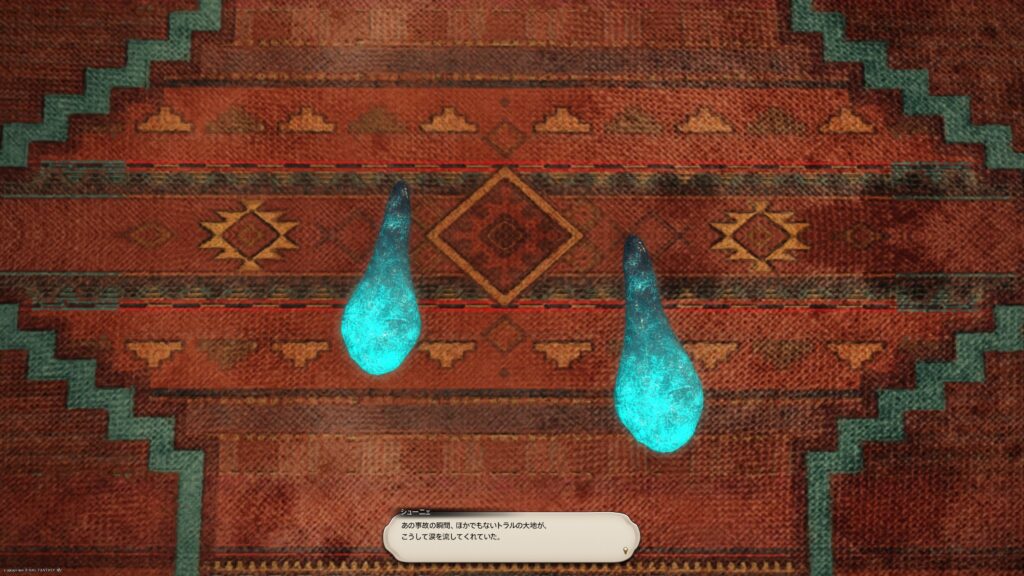 やる気がなさそうとまでは言わないけれど、あまり積極的ではない印象の御仁でした。また、活力に満ちたウヴロが登場するからかな。余計に、シューニェさんの様子が目に止まるんですよね。同じヴィエラ族(シャトナ族)でもずいぶん違いがあるなあと感じたんですが、単純にシューニェさんは、家族を失っていたことが今の彼を形成していたよう。