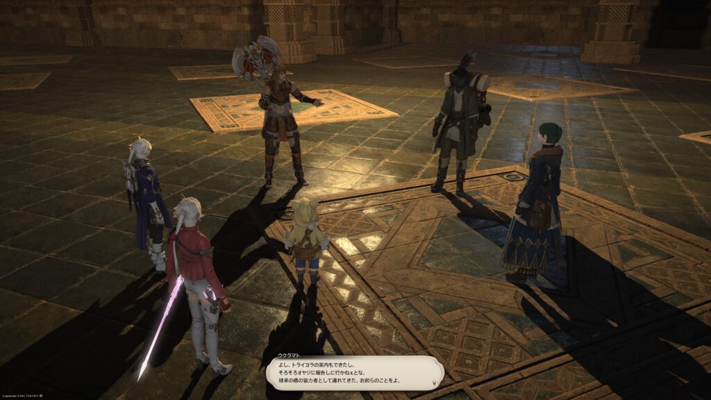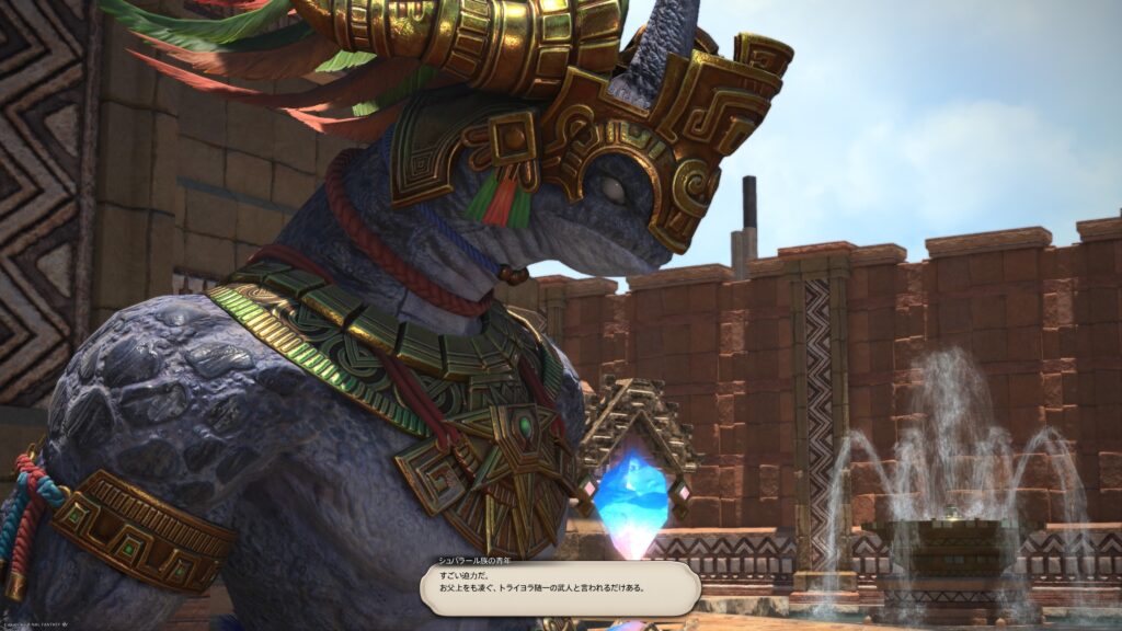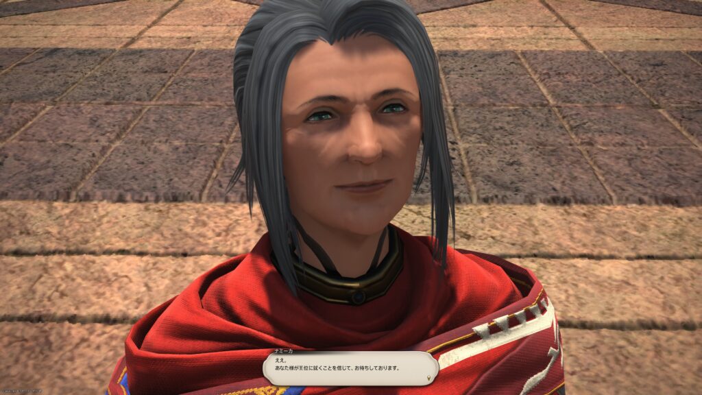 思ったよりもサクッと再会しましたね。アルフィノたちが驚き、素早く状況を察したラマチが「うちのオヤジ、強そうなやつを見かけると、すぐ王宮に呼んで手合わせしちまうんだよ」と教えてくれます。ここで「困った王様だろ?」というラマチの声が、愛情深い響きがあって、好き。