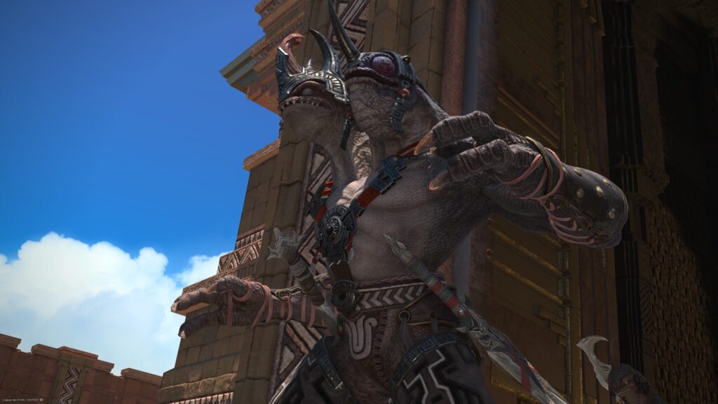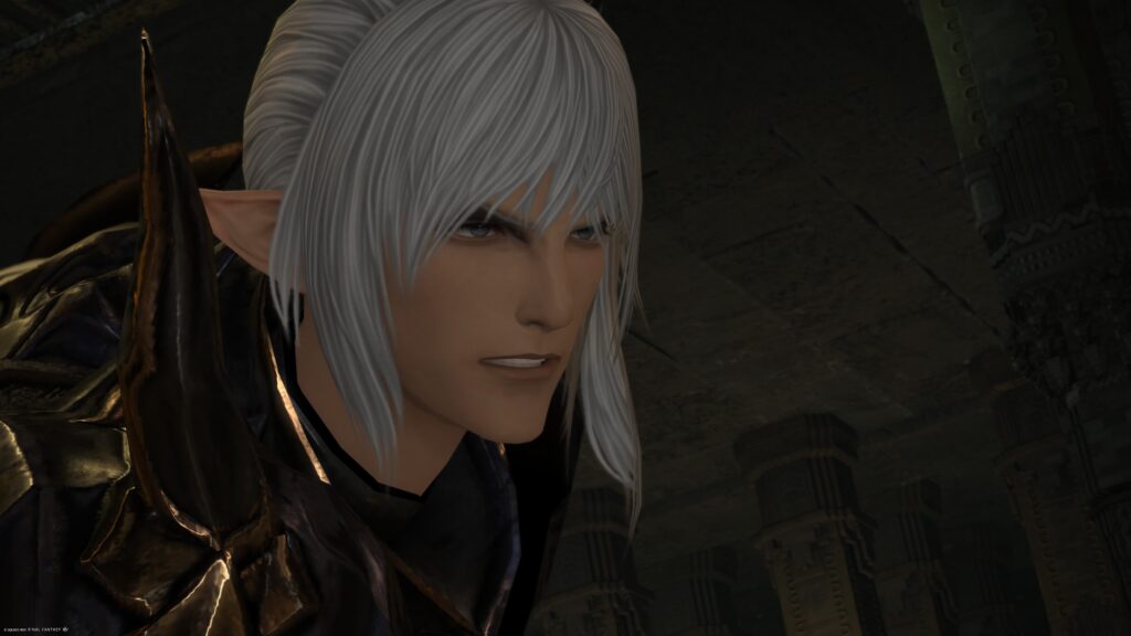 エスティニアンは話かけてきたアルフィノに「東は見たからな。次は西に……と思っただけだ」と応じた後、連王グルージャジャとの戦闘で捉えた感覚を告げます。その言葉を補うように、ラマチが「オヤジもだいぶ歳だからなぁ」と言うのですよ。