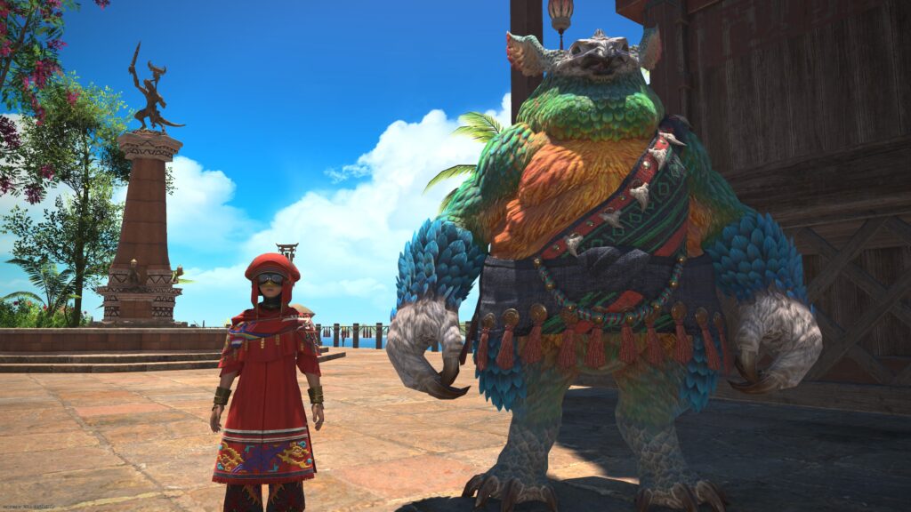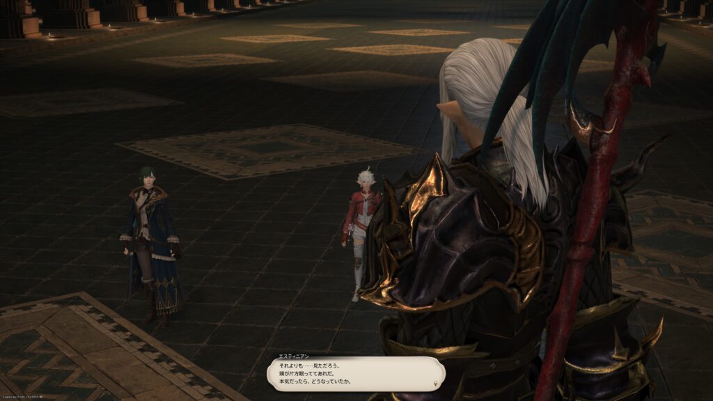 ラマチに気づいた連王が「ここまでだ、外つ国の槍使い! わしの可愛いむすめが訪ねてきたみてぇだからよ」という言葉で戦闘の終了を告げ、さらにはエスティニアンの強さを讃えるのですが、このときエスティニアンが冒険者を示して「ならいいことを教えてやる。あの女は、さらにやるぞ」と告げるわけですよ。