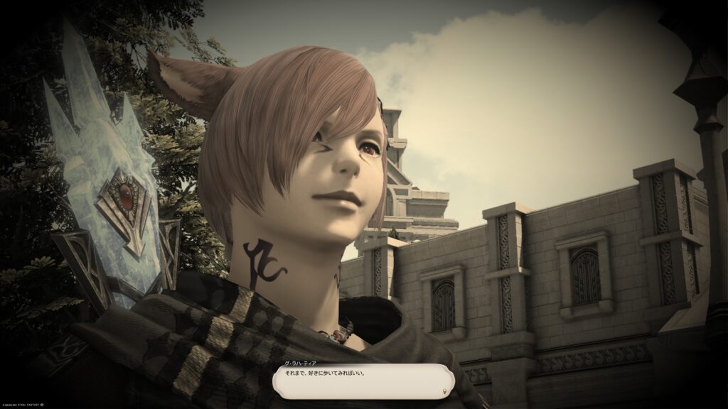 ここで選択肢が出ましたが、わたしは「今はこの旅路を歩いてみようと思う」という言葉を選択させました。グ・ラハの言葉で背中を押されましたが、あくまでも冒険者自身の決断で、ここにいるわけですしね。旅路の責任に、他の人を巻きこんじゃあいけないわ。