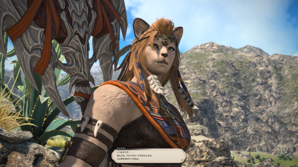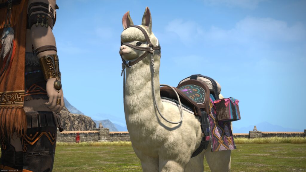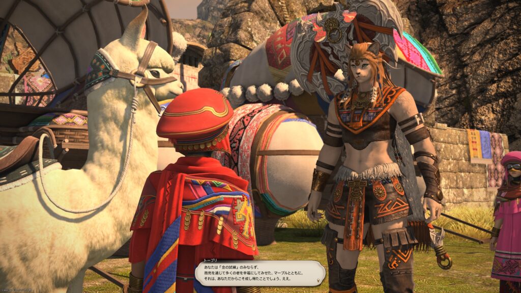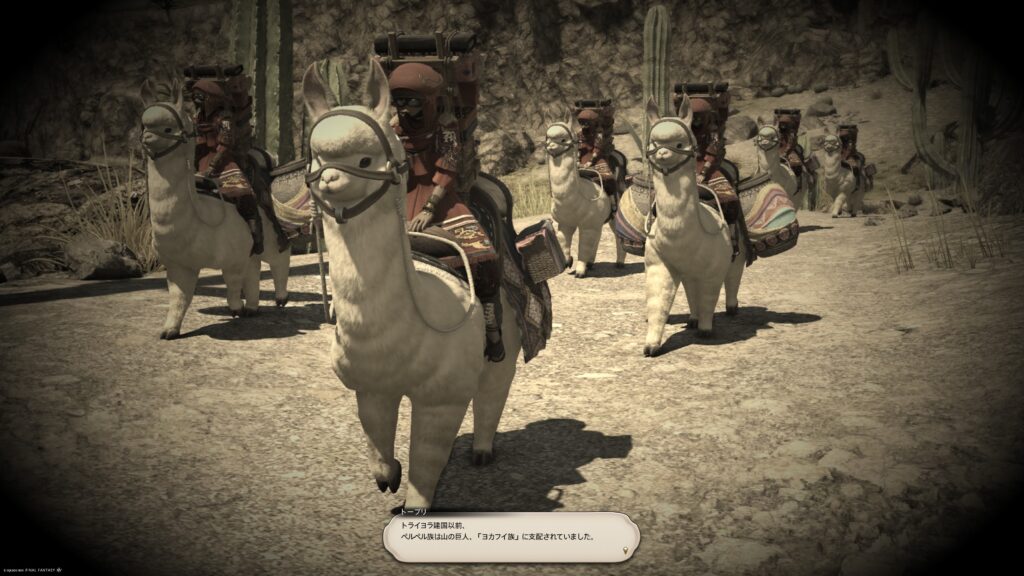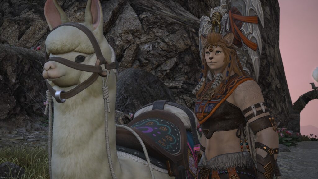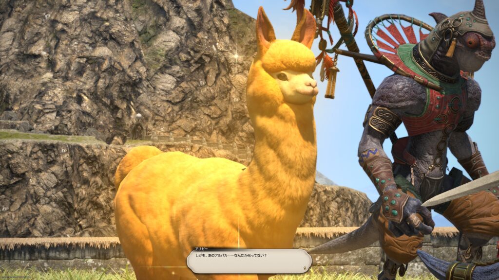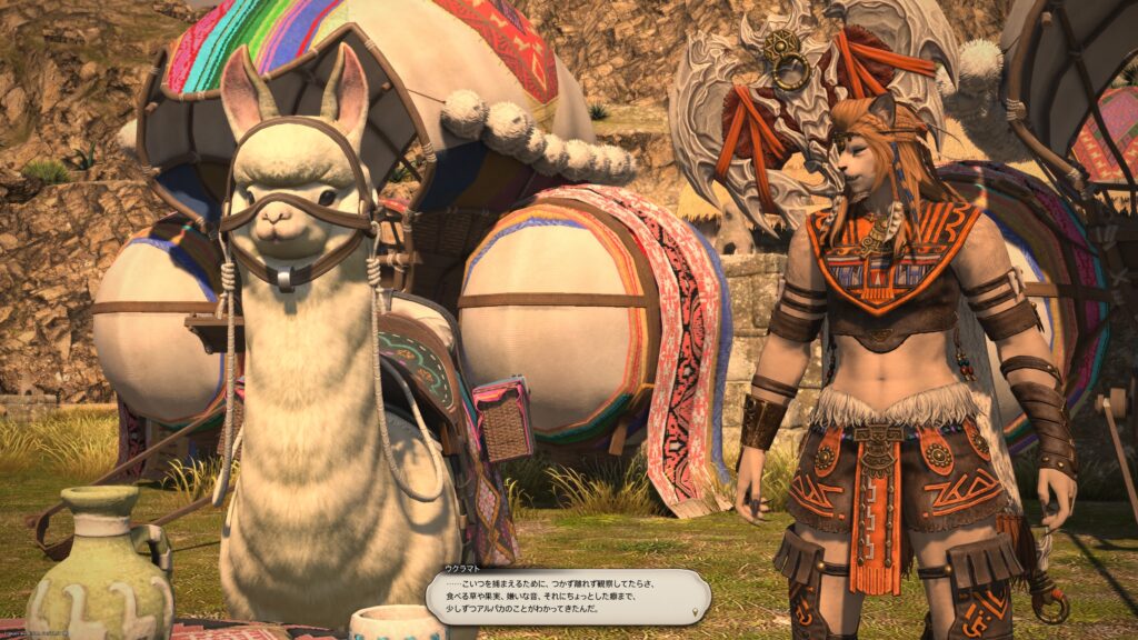 そうして鞍を入手した一行は、アルフィノたちがお手伝いをしている牧場に向かいます。鞍を入手したんだね、と言われたラマチはちょっと緊張しているよう。いよいよ、アルパカ捕獲の準備が整ってきたから、苦手なアルパカと向かい合わなくちゃいけないことを思い出しちゃったんでしょうね。でも冒険者の視線に気づいたラマチは、「わかってる。こんなところで、びびってらんねぇよな」と言って、牧場にいる野生種のアルパカに挑むのです。