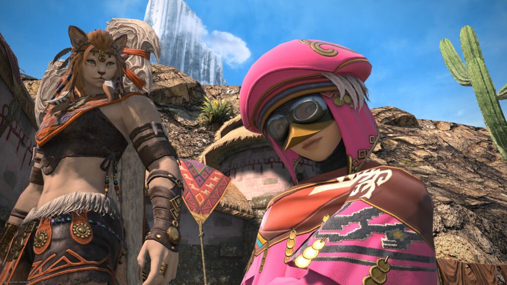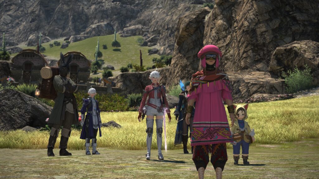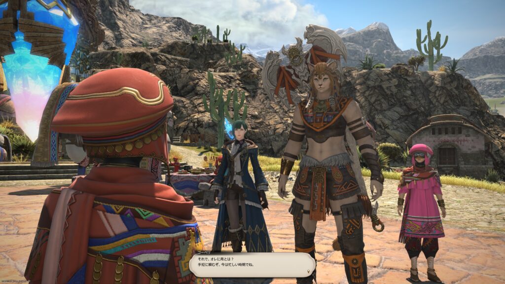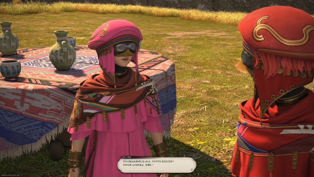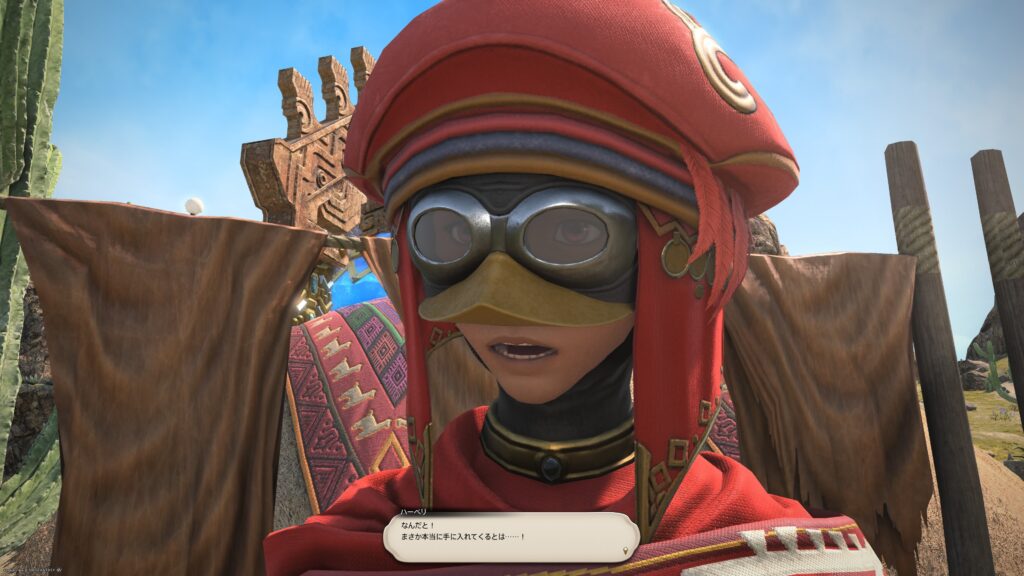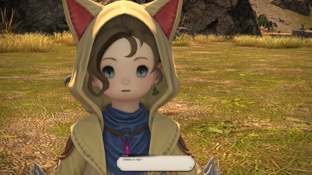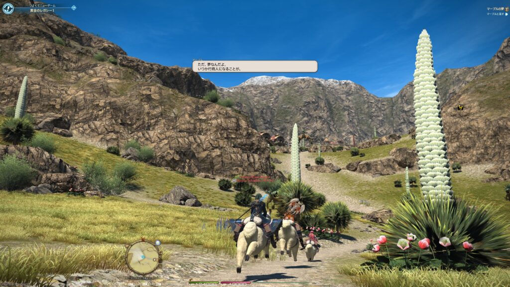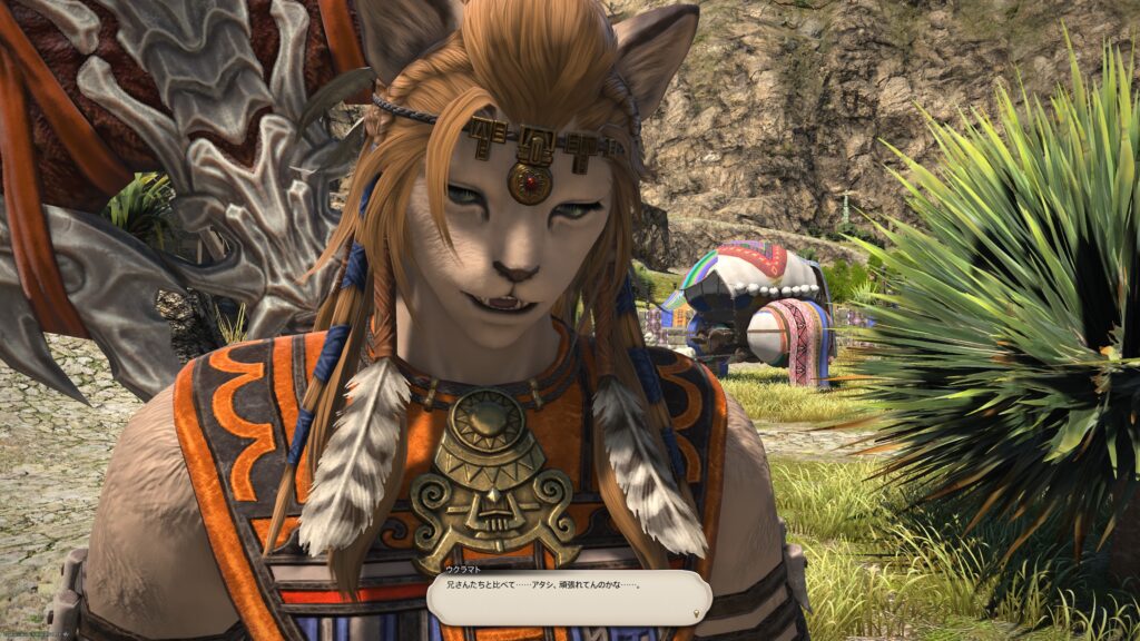 そうして鞍を入手した一行は、アルフィノたちがお手伝いをしている牧場に向かいます。鞍を入手したんだね、と言われたラマチはちょっと緊張しているよう。いよいよ、アルパカ捕獲の準備が整ってきたから、苦手なアルパカと向かい合わなくちゃいけないことを思い出しちゃったんでしょうね。でも冒険者の視線に気づいたラマチは、「わかってる。こんなところで、びびってらんねぇよな」と言って、牧場にいる野生種のアルパカに挑むのです。