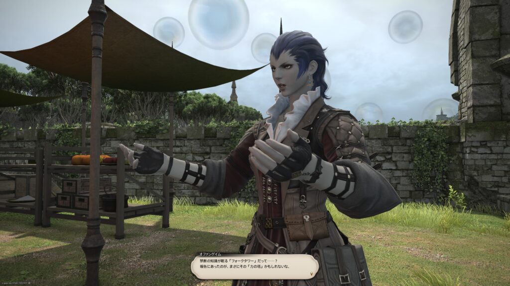 ここでフォークタワーが出てくるんですね。噂は聞いています。なんか、えっらく難しいコンテンツなんでしょ? 野良でクリアできないとか、そういう風の噂が届いているんですけど、クリアしなくちゃ、この物語の真相には辿り着けないのかしら?? ええええ、どうしましょう。まさかのクエスト未クリア物件??