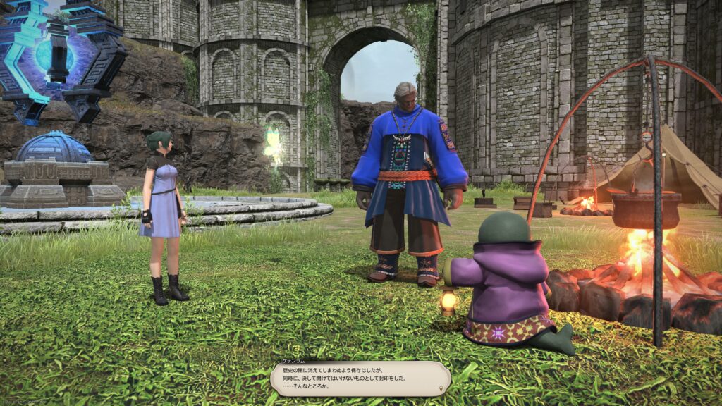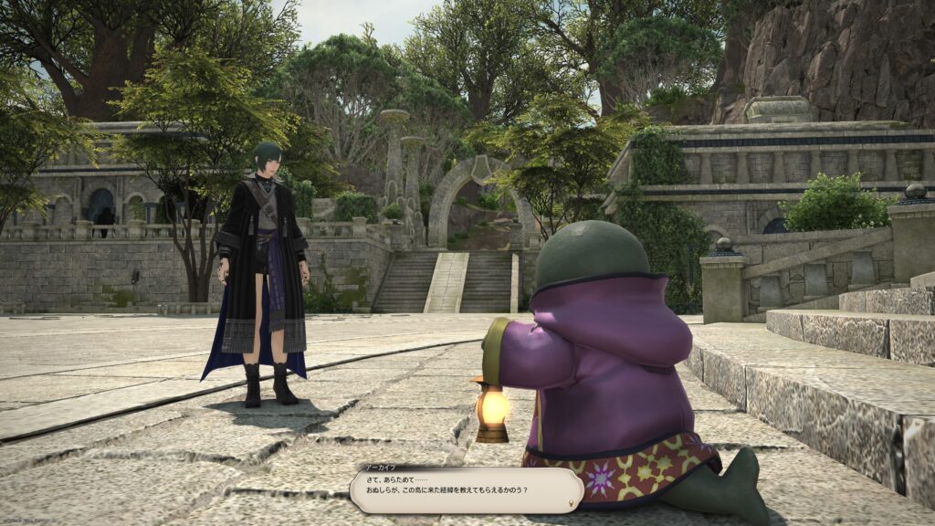 とにかく冒険者たちはアーカイブを連れて、建物を出ます。でね、あたりの古ぼけた様子から、時間の流れを実感したアーカイブは、この島の探索にきた冒険者たちに協力する、と宣言するのでした。