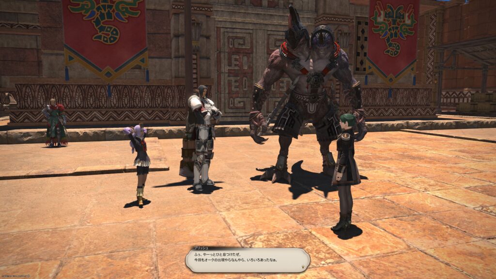 と、プリッシュが教えてくれました。ふむふむ、ヴァナ・ディールではそんな存在なんですねえ。アルシャールがこの世界にもオークは存在するのか、と訊ねてきましたが、冒険者が答える間もなく、オークたちは消えました。