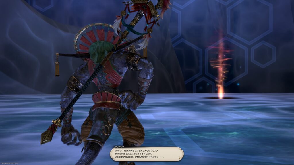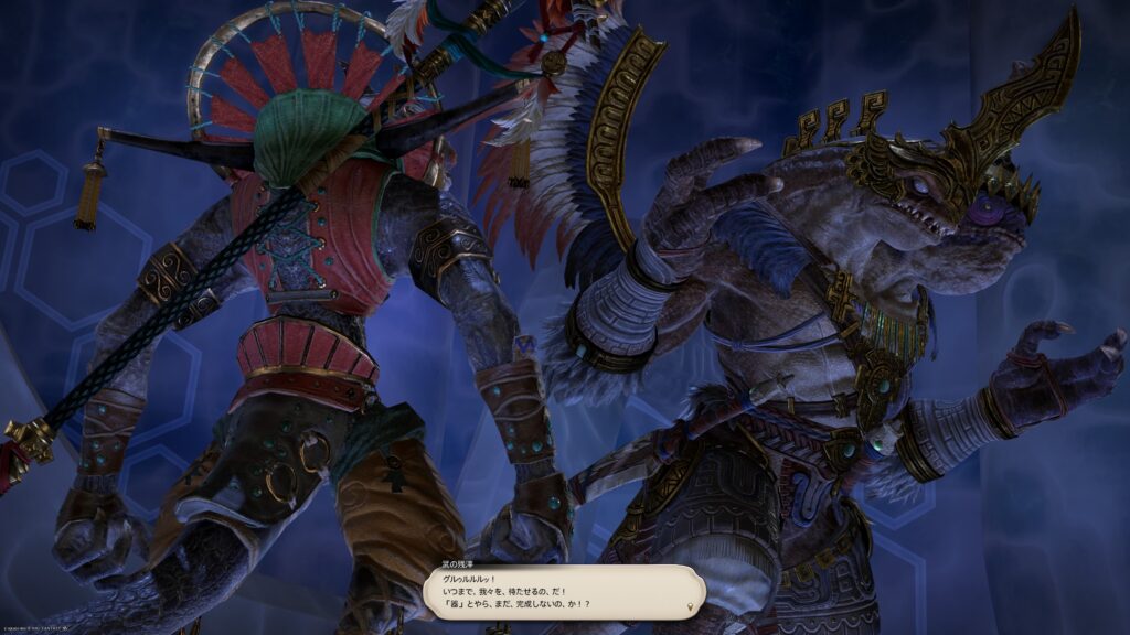 だってさ、サレージャの言葉の薄っぺらさって、カラムナートが気づいたように、わかりやすいんですよ。この言葉だって、芯から出た言葉ではないとわかる。でね、このFF11の? グルージャジャっぽい存在も、サレージャのそういうところに気づかないはずがないと思ったんですよね。