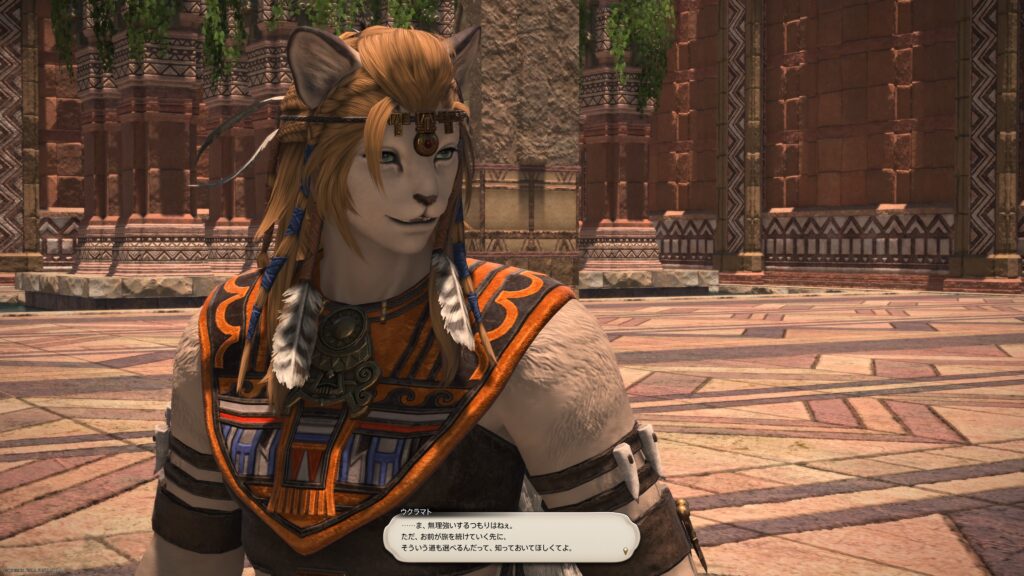 それで冒険者が「ウクラマトが頑張ったからだ」と返すと、嬉しそうに笑うんですよねこの人。やっぱり妹大好きーな兄ちゃんなんだなあ、と、ほのぼのしていると、思いがけないことを言われました。ラマチからの伝言でね。