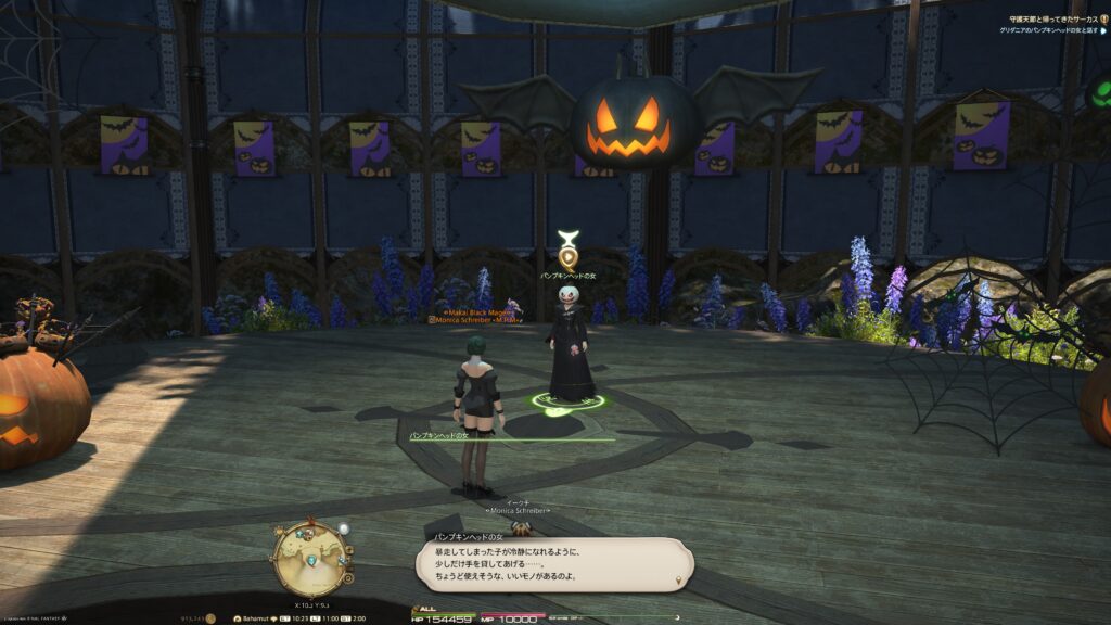 とにかく現れたパンプキンヘッドの女性に話しかけたところ、とある団体が近くの廃屋敷を借りて、とある催しをしていると教えてくれるんですよ。