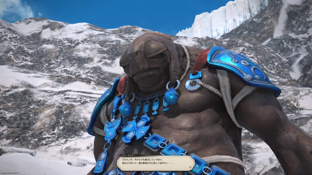 ヨカフイ族のクエスト「雪山に住まう精霊」はこちらの、ファーラファーさんに話しかけることによって始まります。ヨカフイ族の性別はわからないけれど、どうやら女性であるよう。冒険者は、このファーラファーさんに職人の心当たりはないかと訊ねられ、立候補するのですよ。