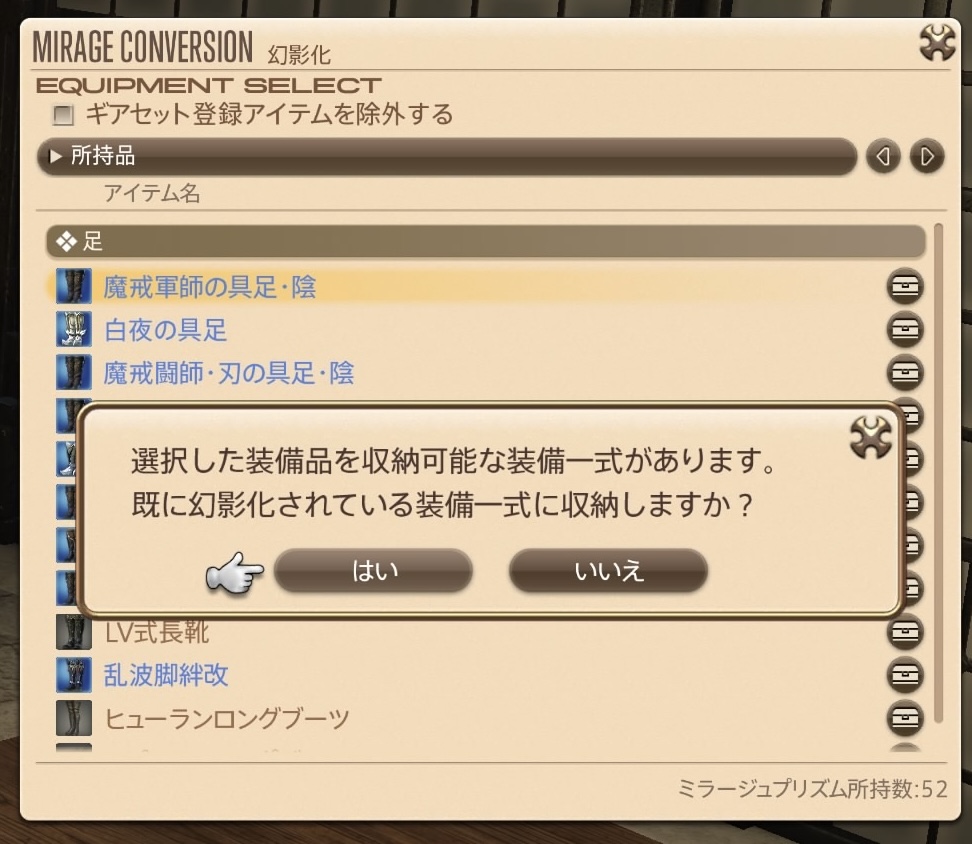 だから今後、ミラージュドレッサーに装備品を入れたい時は、とりあえず、「まとめて幻影化」を選ぶようにしたらいいんだな、と受け止めました。そうしたら、まとめられた装備品一式が、ミラージュドレッサーの収納可能数内のひとつとして加算されるわけだから、かなり省スペースだと感じましたよ〜。