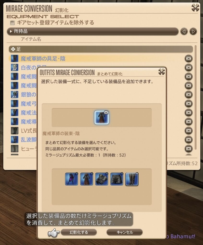 ミラージュドレッサーに収納されている装備一式に、さらにまとめて幻影化をする方法は簡単です。