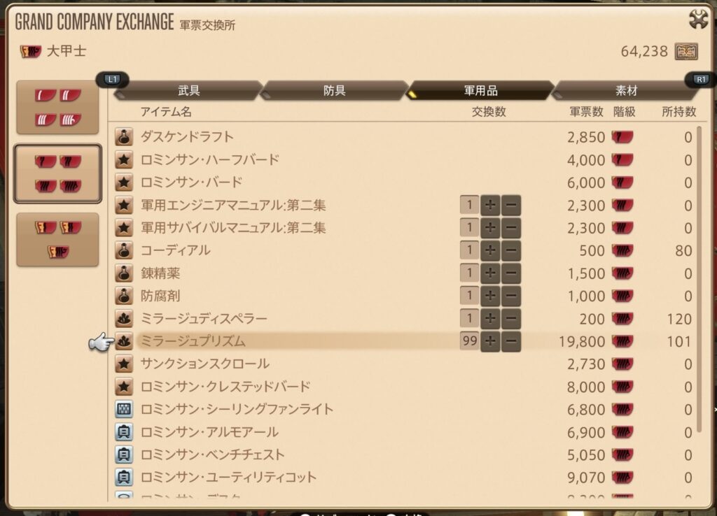 グランドカンパニーの位が育っていたら、ミラージュプリズムは軍票200で1つ、交換できます。