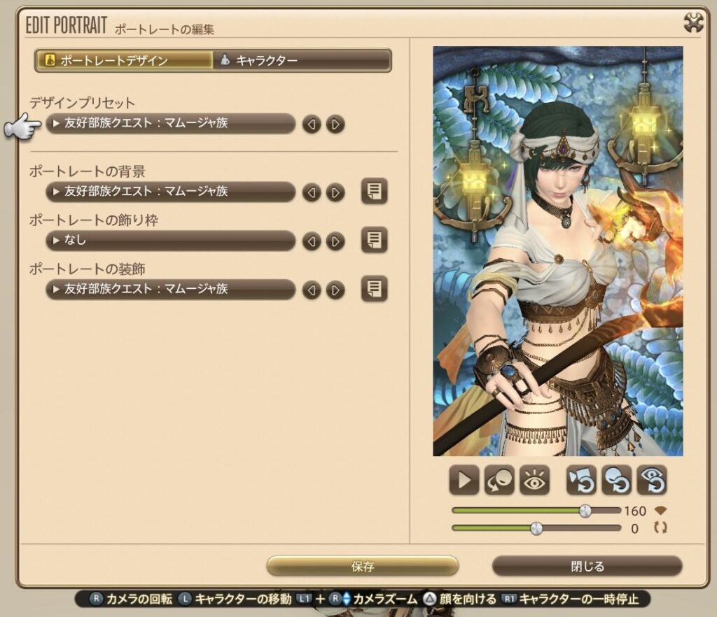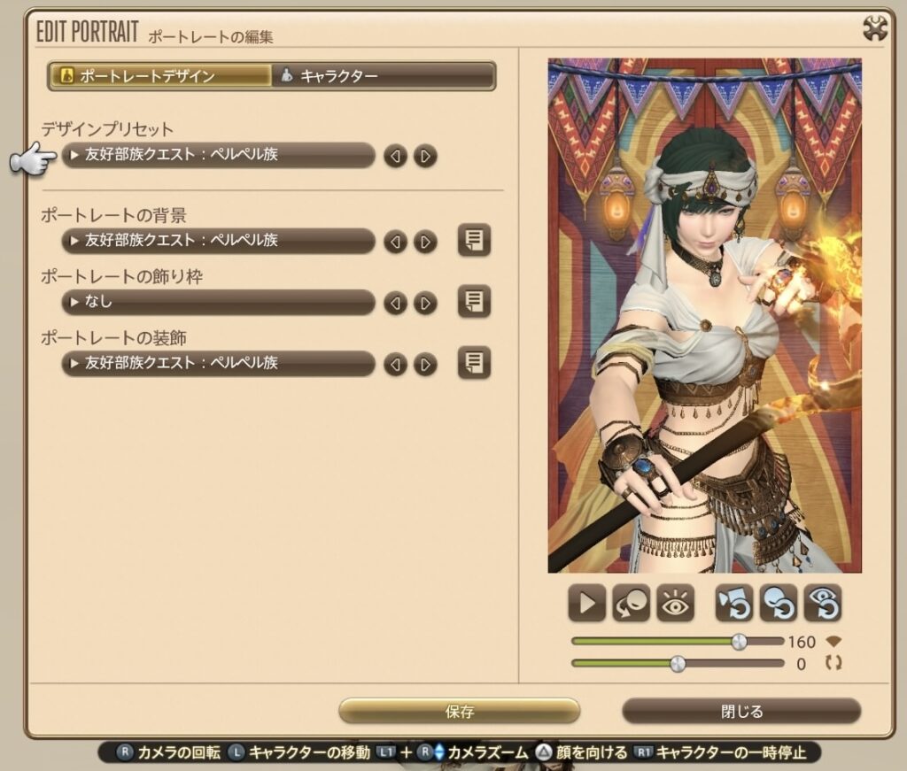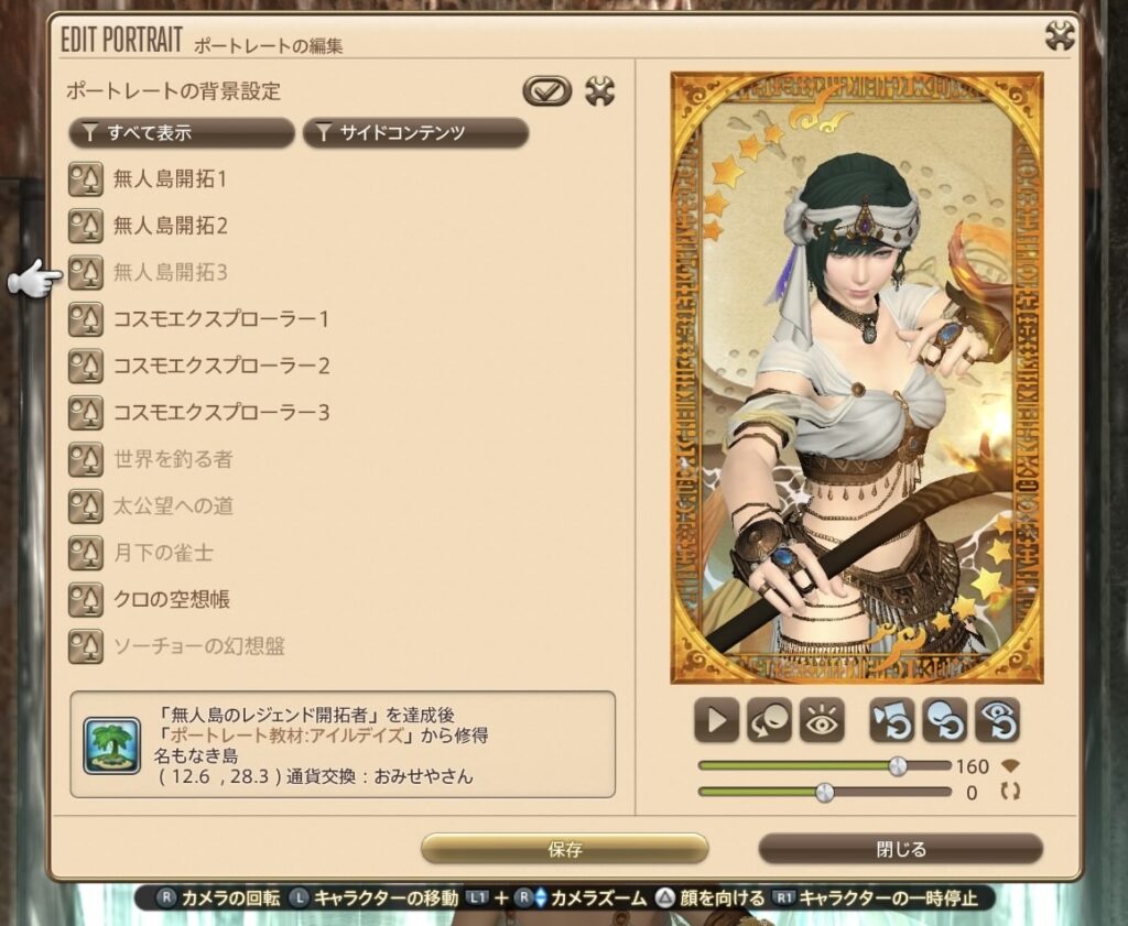 「すべて表示」にしているから、入手したものと入手してないものが一緒に表示されていますね! たとえばわたしの場合、「無人島のレジェンド開拓者」というアチーブメントを達成してないから、ポートレート教材アイルデイズは入手できていません。でも入手してなくても、どういうデザインなのか、右のプレビューで見ることができるのです!