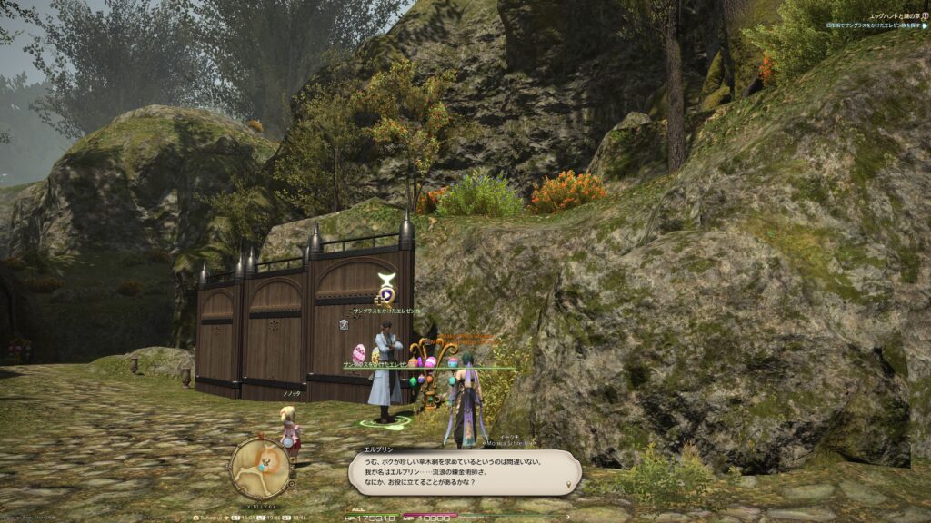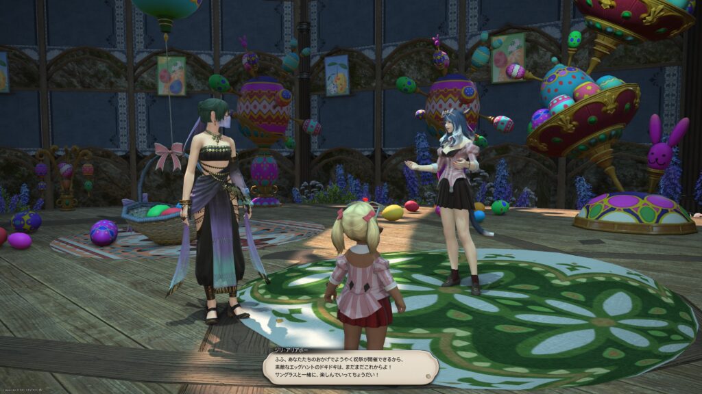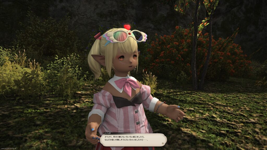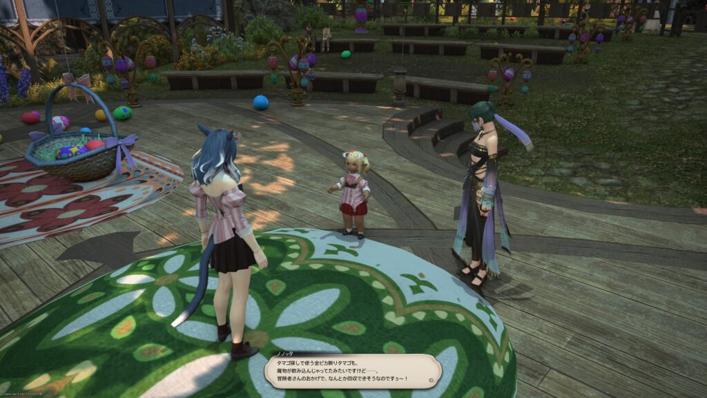 こんなことを言ってるエレゼンの男性はさておいて、ノノッタちゃんは心配されてたとは思ってもいない様子。なんでも、会場で隠しタマゴを隠していたら、急に背の高い草が生えてきて、どうしたものかと考えていたそうです。もしかしたら草の魔物かもしれないと思い当たったノノッタちゃんは、タマゴ探しを楽しめる状況にするため、手伝って欲しいと冒険者にお願いしてくるのですよ。