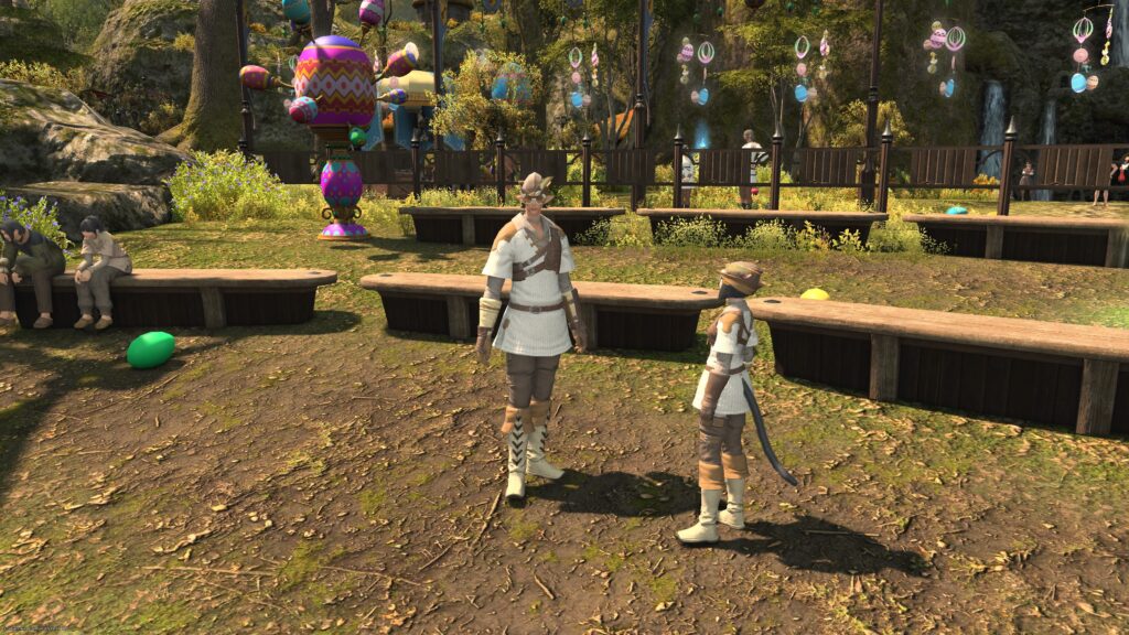 この人物にも話しかけられません。おひさしぶりです、ベアティヌ先生。夜になると輝く飾りタマゴと共に木の根元でじっと……、……何をしているの? とは気軽にきけない雰囲気。うーんグリダニアの子供達とかくれんぼでもしているのかしら??