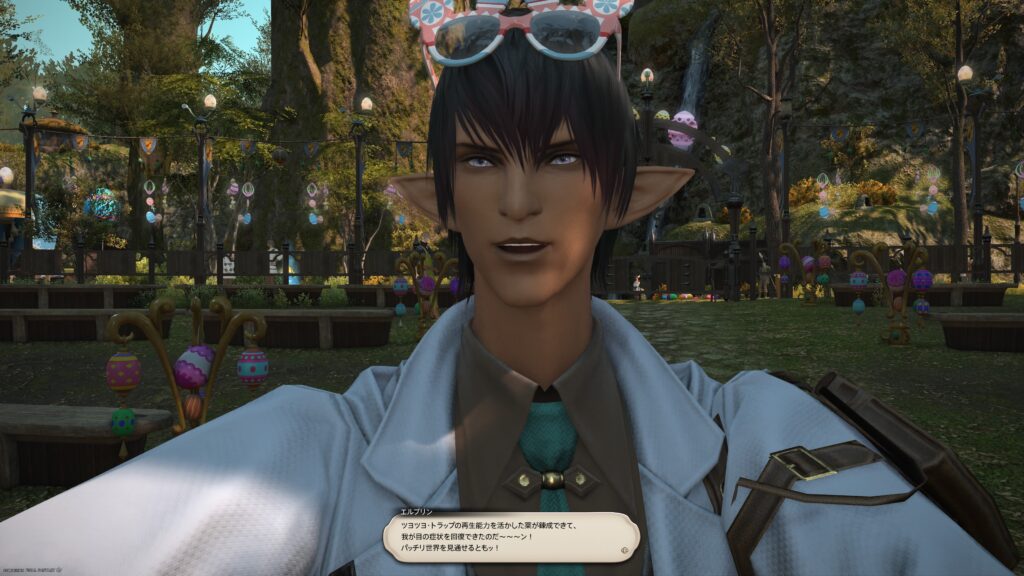 あ、それでね、黒衣森の一帯を使わせてもらって、草原で金ピカの飾りタマゴを探す催しの準備をしているそうです。そして賞品は、ジリさんが身につけているサングラス。ところが、会場で準備中のはずの実行委員、ノノッタちゃんからの連絡が途絶えたそうです。何があったのか、心配だから冒険者が様子を見にいくことになりました。