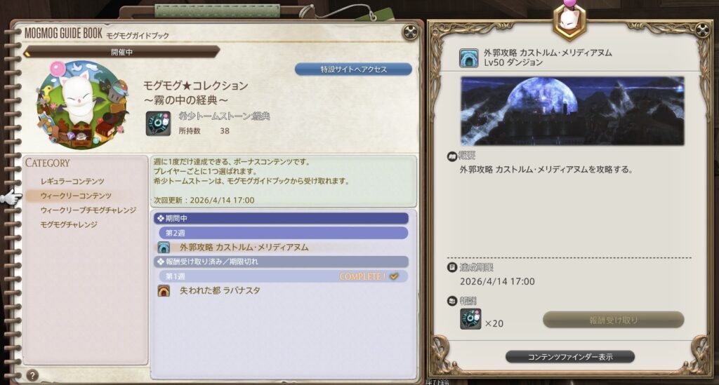 そういえば、昨日、モグモグガイドブックを眺めていて気付いたんですが、ウィークリープチモグチャレンジとモグモグチャレンジはみんな共通で、ウィークリーコンテンツはプレイヤーごとに選ばれるものだったんですね。
