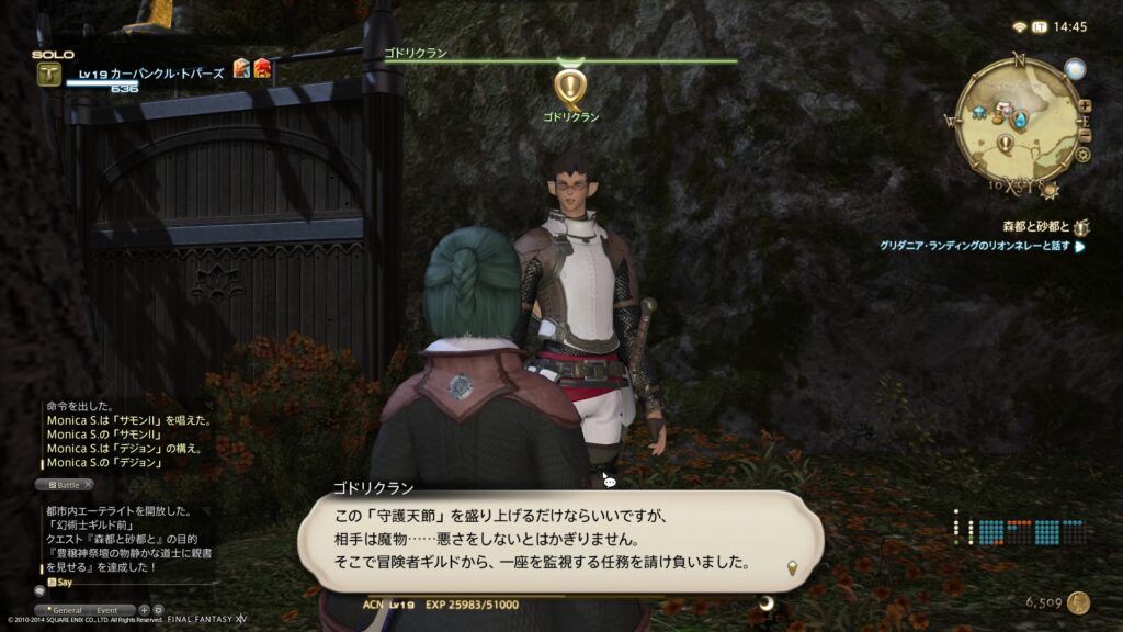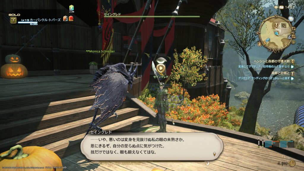 このとき、リムサ・ロミンサでサーカス関係者に話しかけたときの違和感が消えましたね。だって、守護天節が祭り騒ぎになっていることを忌々しく感じている、と伝わってくるコメントが返ってきたんですもの。そのときは、なんらかの裏設定があるのかな、もしかしたら人間じゃないのかな、でもクエストマークは付いてないからわからないままだなあ、と考えてました。このあたり、まだ、ゲームがよくわかってなかったときですから、ビミョーにすっとぼけています。そういうもんさ。