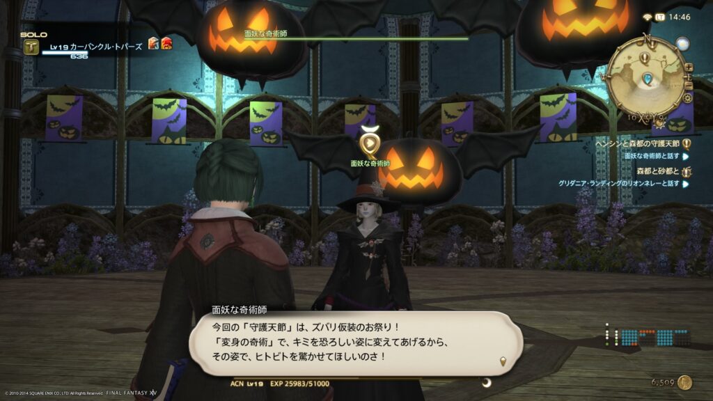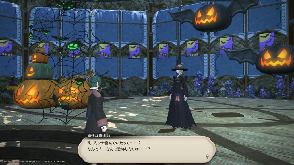 わたしがFF14をはじめた日は、10月30日です。ですから、そのときにはすでに、とあるイベントが始まっていました。期間限定のイベント、シーズナルクエストですね。なんでも、10月20日から始まってたみたいなんですけど、ゲームをはじめたばかりのわたしに、イベントを気にする余裕などありません。だから、街のあちこちにあるハロウィンの飾り付けを目に映していても、スルーしてたのですよ。ええ、わたしが初めて体験した、期間限定イベントはハロウィン的なイベントでした。どうりで、飾り付けがあちこちにあるわけです。