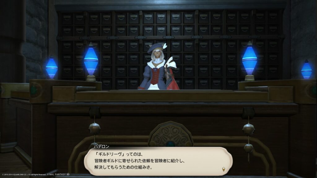 ひとつめがね、「ギルドリーヴ」というものです。こちら、リムサ・ロミンサなら冒険者ギルドの一角に受付があります。つまり冒険者ギルドから依頼されるクエストなんですけど、何度でも受けられるクエストなんですよ。