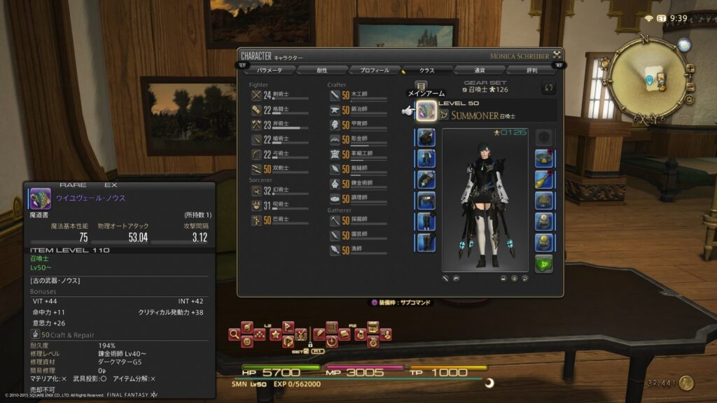 メインクラスの「巴術士(召喚・学者)」と「双剣士(忍者)」、それから製作職と採集職がカンストしてます。ほかのクラスはLV22〜LV32をちょろちょろとしてますね。これからの攻略目標として、⑴すべてのクラスのカンスト、としておきましょう。