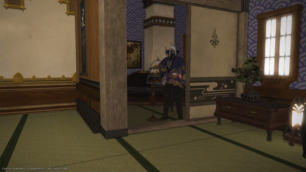 フスマパーティーション(モードゥナで購入)で区切られた小部屋はリテイナーさんのお部屋です。素材屋さんにはお部屋がありませんけど、リテイナーさんには用意した。差別じゃありませんよ! ……単に、フスマパーティーションを使用したかっただけなの。ええ。