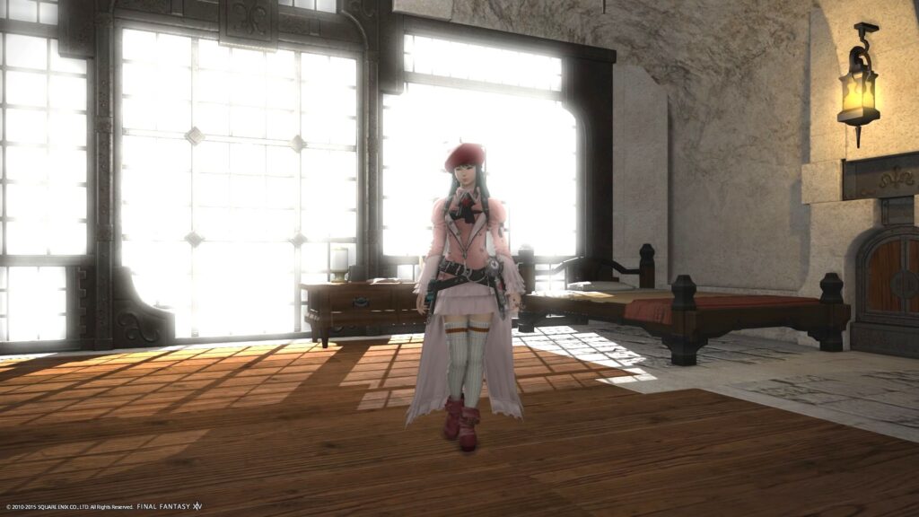今回の目玉はですね、なんといっても「スカラーキュロットRE」ですよ! このハイソックスの感触が欲しくて、でも色が合わないなあ、と困っていたんです。かといって、他の装備はピンとこなかったし。裁縫師の製作手帳を探しても、同じような感触の装備がない。いや、でも以前、どこかで同じ感触で白いハイソックスを見たぞ、と考えてネット検索したら、ジョブ装備を染色したい時に、必要なあれこれを知ったのでした。