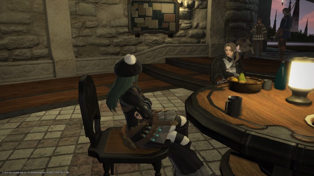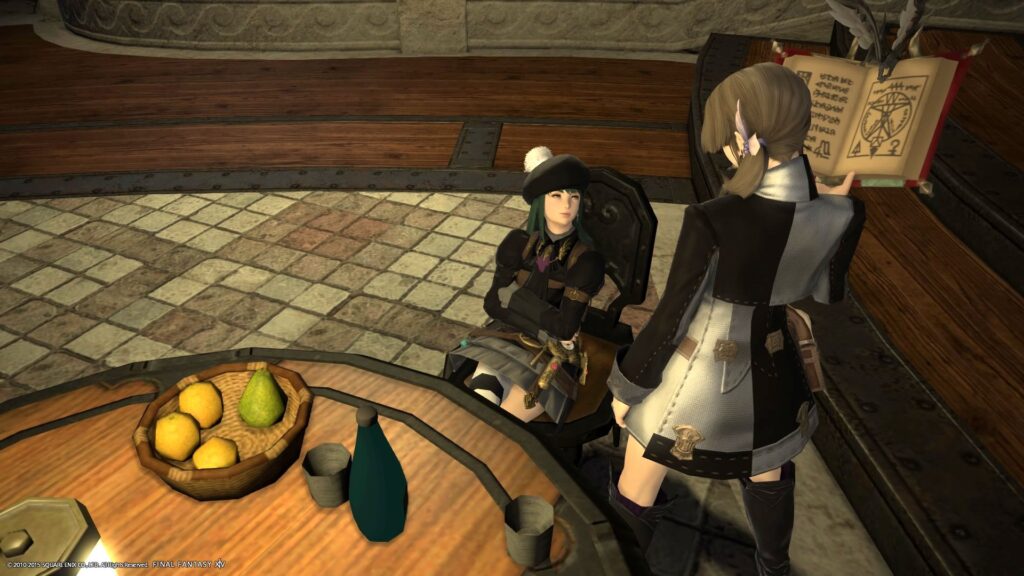 フフフ、わたしにとっては始まりの地でもある、リムサ・ロミンサの冒険者ギルドにていっぱいひっかけたのさ。魔道書をメニュー代わりにして、お互いの注文を聞いたり……♪ などと、楽しく戯れてしまいました。よく考えたら、いそがしかただろうなあ、と、今になってジタバタな焦りが出てきたよ、あうあう。
