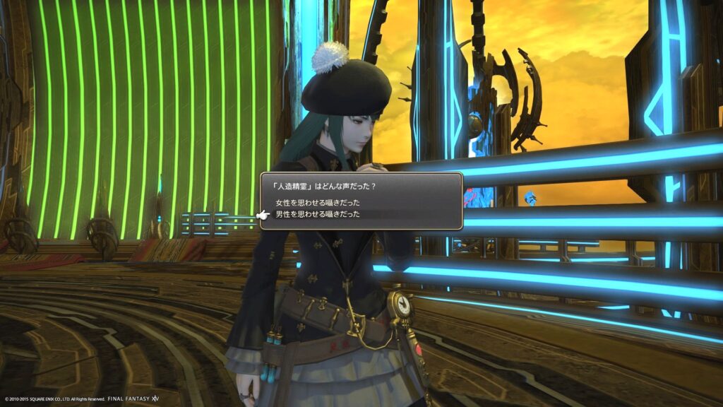 とにかく、そういう武器だからこそ、第二段階クエスト、終わり間際になると、武器が話しかけてくるんですよ。で、その時に出てくる選択肢がこちらです。男性か、女性か。うわあお。 思わず10秒ほどフリーズして、考え込んでしまいましたよ。どっちかを選ぶことによって、能力が違ったらどうしよう、とか、あれこれね。