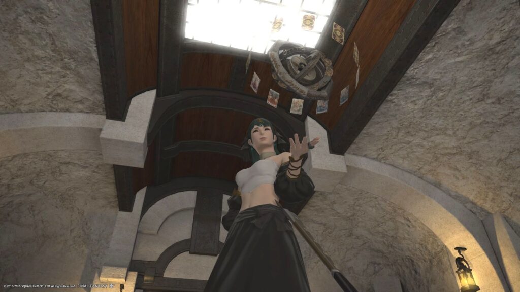 このミラプリのヒントは、ゴールドソーサーのダンスマスターからいただきました。ミラプリする前に参加したG.A.T.Eでね、カミーズ+セーラーブレーをダンスマスターが着ていてね、「なかなかええなあ」と感じて、活用してみたの。占星術だからスカート! というこだわりも発動させましたね。あと、ツイッターでハロウィン胴装備とサベネアンアームレットを合わせてるミラプリを見たことがあって、だからサベネアンアームレットを持ってきたのでした。装備カラーを黒にした理由は、ショートブーツに合わせて。こちら、染色できるショートブーツじゃないんですよねえ。そちらはまだ作れない〜(涙)