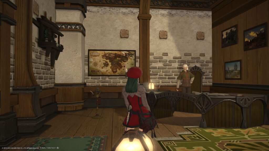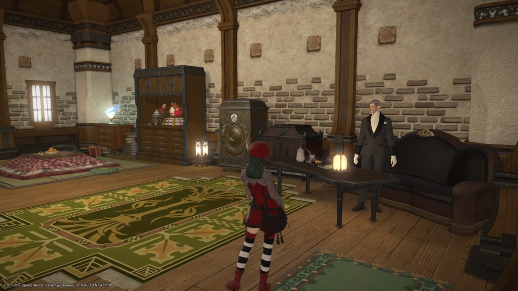 使用人さんの前には、シュラウド・ティーセットを置いていますけれど、素材屋さんの前には仕事がらみの書類しかありません。ちょい悪オヤジだから、酒とつまみ希望なんですよきっと(適当) いや、現実的には、部屋のアイテム数がギリギリだから、という理由なんですけどね。シュラウド・ティーセットも3.2導入前には消えていると思います。ほら、オラトリオンがやってきますからねえ〜♡ いろいろな曲を再生するのだ、そうなのだ! あれとこれとか、その曲どの曲とか!