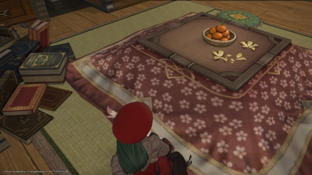 ええ、まさしくわたしのリアルコタツまわりを再現できましたね! この演出を思いつかれたかたは、本当にすごいなあと感じています。攻略だけではなくて、ハウジングまでも、エオルゼアにはすごい発想をされるかたがたがたくさんいらっしゃいますねえ。おかげさまで自分では気づかない、たくさんの楽しみ要素を知ることができて、嬉しいです。ありがと〜!!