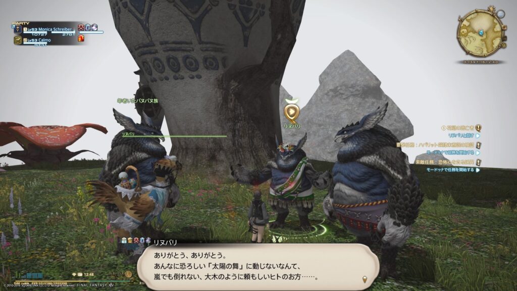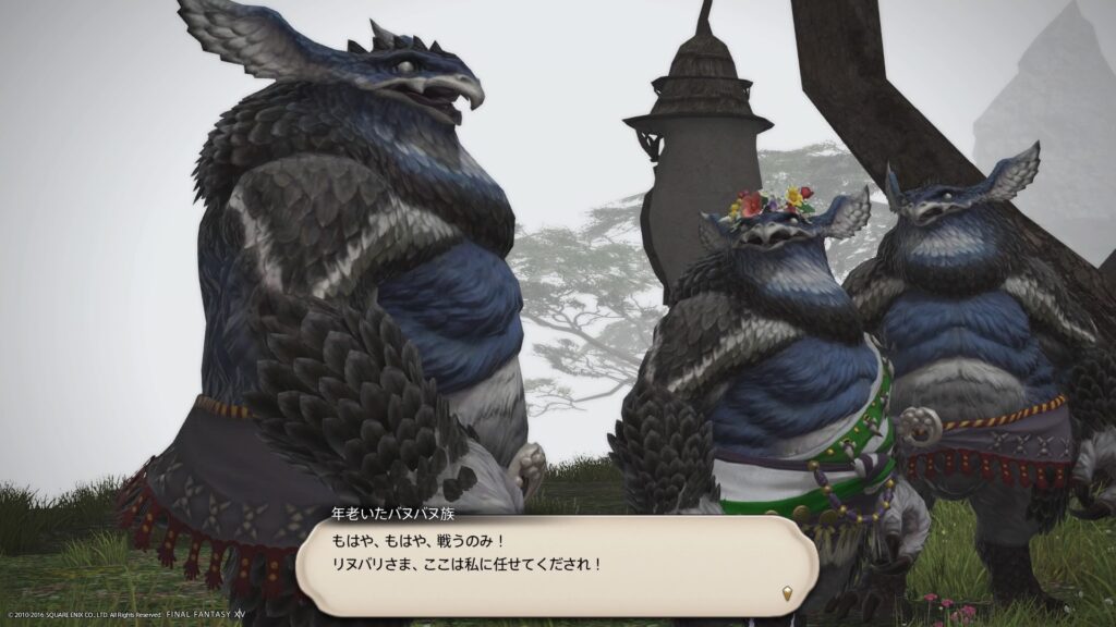 とにかく冷酷なるブンドによって、住むところを追われた三名は、オク・ズンドに住む「大らかなズンド」の長の計らいによって新たな住み場所を得ました。そして、その再興のお手伝いが、蛮族クエスト:バヌバヌ族のデイリークエストとなるみたいですね。蛮族クエスト:イクサル族の時みたいに製作品を納品するわけではないけれど、デイリークエストをすればするほど、村が育っていくのかしら? う〜ん、どんな感じに育っていくのかしら。新しい施設ができたりなんかしたりして! あ、なんだかワクワクしてきたなあ〜♡