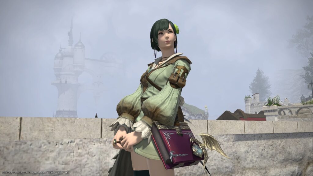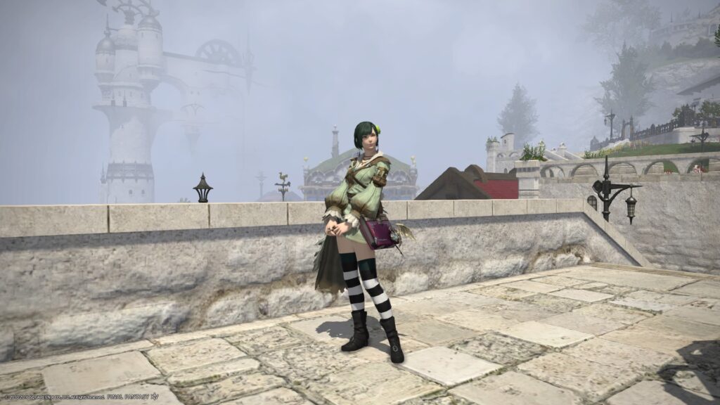 いちばんのポイントは、んー、やっぱり頭の飾りですかねえ。ええ、パッチ3.3で導入された鉢植えで育つお花を使った飾りですのよ。ちょうど、この色合いにピタリとくるグリーンを友達が持っていたから、黄色と物々交換して、錬金術でシャーッと作りました!