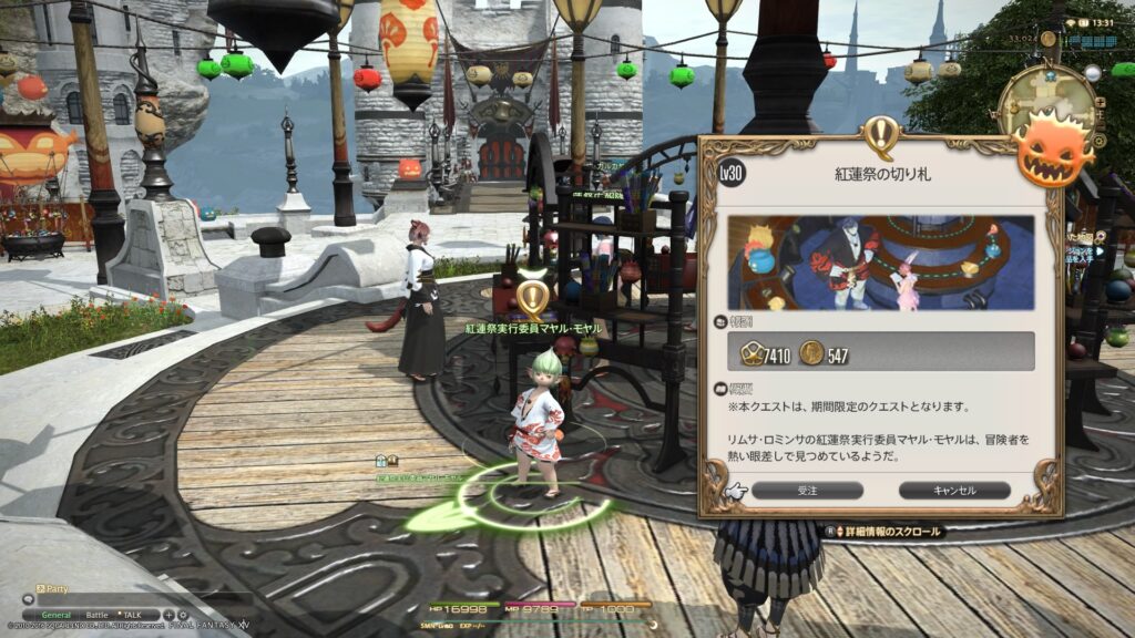 というわけで、いったん、クエストを受注した状態でFCハウスに帰り、浴衣を用いたミラプリをしてから、コスタデルソルへ向かいました。昨年も紅蓮祭はこちらでありましたし、もう、常夏のリゾート地ですねえ、こちら。