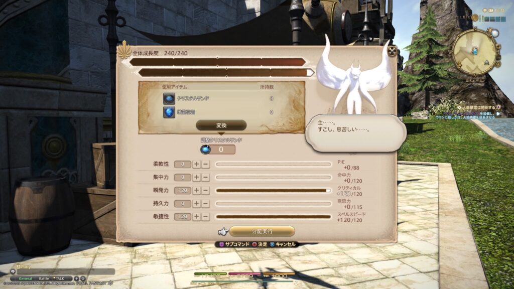 いよいよ、サブステータスのポイント振り分けの最終段階にて、人造精霊くんの様子がおかしくなりました。今までは「主のために強くなる」とか、そういう類の健気極まりない発言ばかりだったのに、不調を訴える発言なんです。これは相当苦しいんだな、と思いつつ、最後のサブステータスを振り分けたところ、ちょっとおののくカットシーンが入りました。