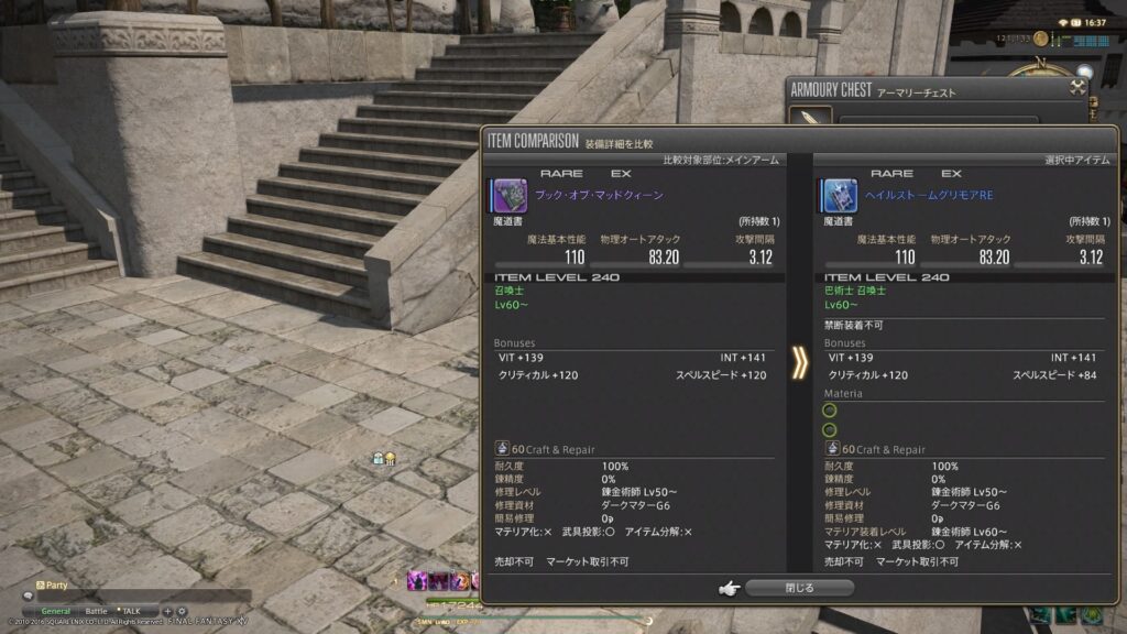 いや、アイテムレベルは一緒なんですよね。で、サブステータスも、VITとINTが同じ数値で、強化対象にしていた、クリティカルまで一緒。ただ、これも強化対象にしてたスペルスピードは、さすがにアニマウェポンのほうが優ります。伝承強化武器にマテリアの穴がありますが、たとえ詠唱のマテリジャふたつをはめ込んでも、アニマウェポンのほうが勝ってますよね。って、詠唱のマテリジャははめられないんじゃないか、と思いますが!