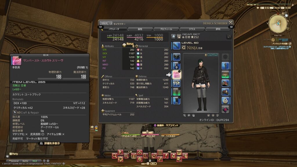 まだ、装備が揃ってなかったから、大喜びで装備しました。で、ついでに、カフスがミラプリされてたから、合わせるように忍者装備を変更しました。歌姫もいいけど、やはり、忍者は闇に生きる隠密でござるよ。というわけで、黒でまとめたミラプリにしたのですね。