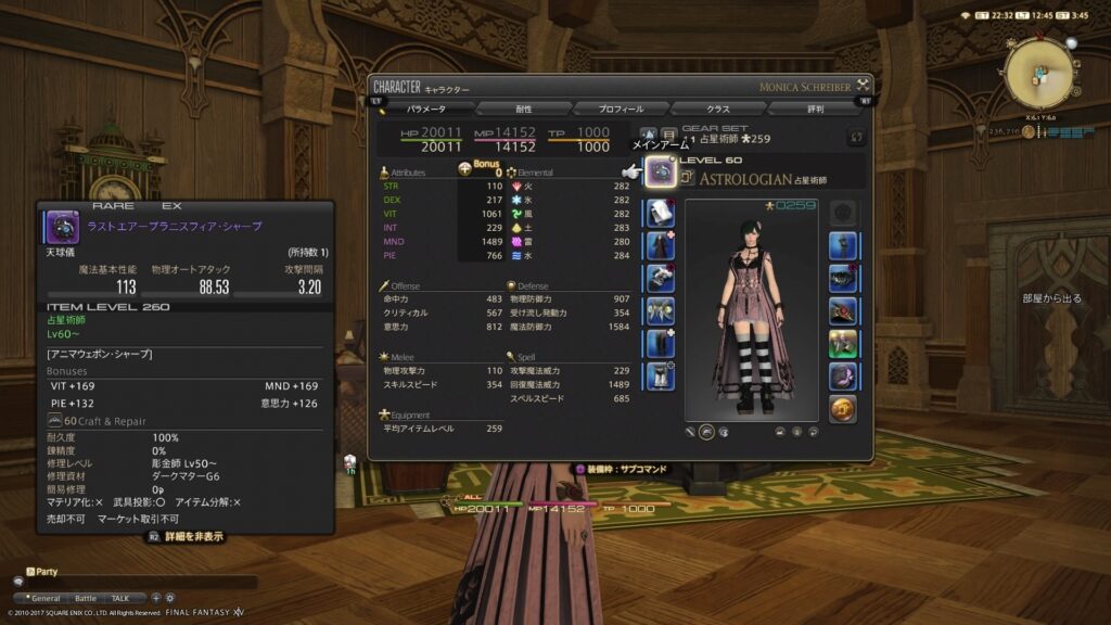 とっても困って、あれこれ考えたのですけれど、……2016年秋に発売された、「ファイナルファンタジー14マガジン2016年秋号」内に掲載されてるヒーラーガイドによりますと、白魔道士や占星術師があげたいパラメータは意志力、とありましたから、まずそちらをギリギリまで。そして残るパラメータは、スペルスピードかPIEか命中、となりますよね。ここでもあれこれ悩んで、結果、PIEにしました。